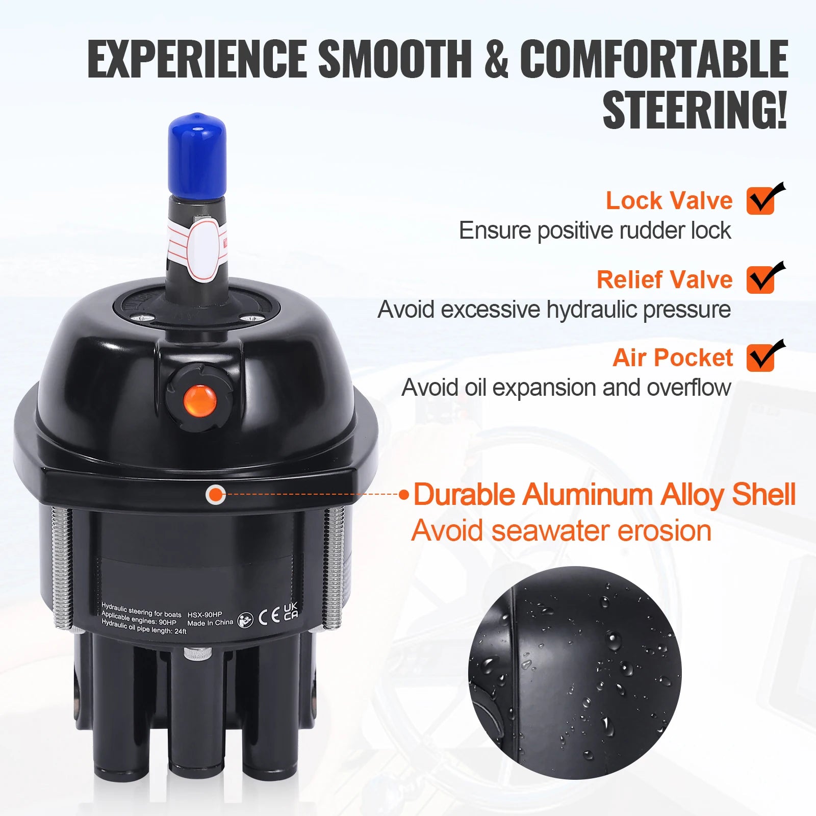 Prilagodba je jednostavna s crijevima prilagođenim rasporedu vaše brodice: odaberite dva crijeva od 24 stope ili dva crijeva od 26 stopa, izrežite prema vašoj instalaciji i brzo povežite s brzim spojnicama 5/16". Sve što je potrebno za instalaciju uključeno je—hidraulički upravljački cilindar, hidraulična pumpa, crijeva i sveobuhvatan pribor—tako da možete brzo i sigurno na vodu.