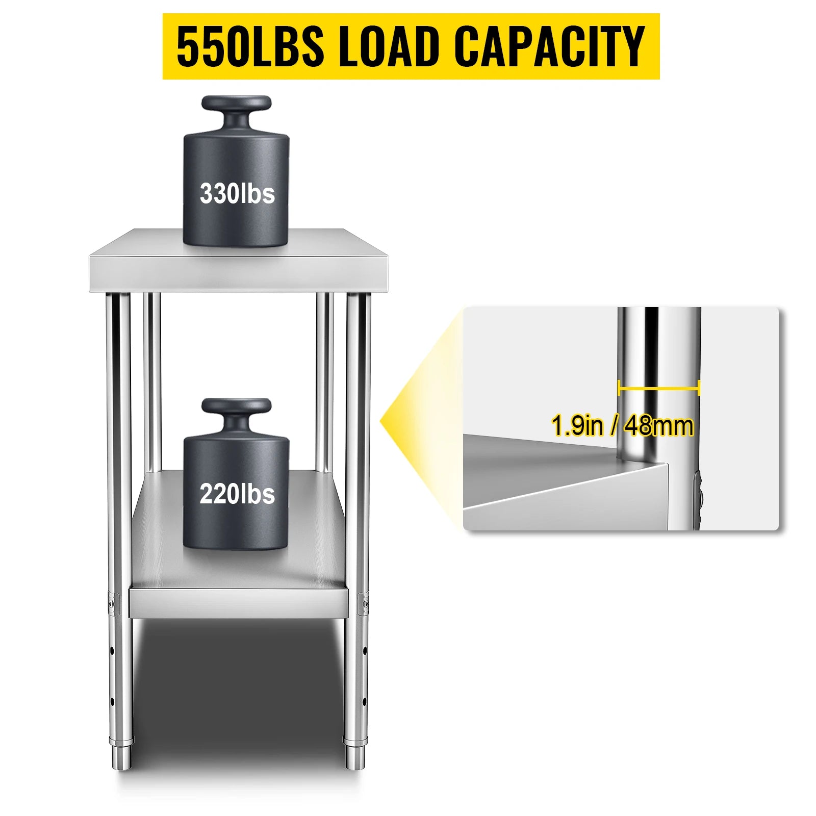 Predstavljamo Radnu pripremnu stolicu od nehrđajućeg čelika 48x18x34 — robusnu, profesionalnu pripremnu stanicu dizajniranu za kuhinje s visokim zahtjevima. Izrađena od izdržljivog 201 nehrđajućeg čelika s završnom obradom žičanog crteža, otporna je na hrđu i lako se čisti. Radna površina i ojačane noge pružaju trajnu snagu, podržavajući ukupno do 550 lbs: 330 lbs na gornjoj polici i 220 lbs na donjoj polici. Donja polica je podesiva kako bi se prilagodila različitim veličinama opreme i zaliha. S podesivim nogama za ravno postavljanje i brzu instalaciju, ova stolica pomaže vam da pojednostavite pripremu, uštedite prostor na podu i zadržite bitne stvari na dohvat ruke. podržava svoju čvrstu opremu vrhunskom kvalitetom, nevjerojatno niskim cijenama, brzom i sigurnom dostavom, povratom u roku od 30 dana i uslugom 24/7.