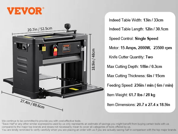 Upoznajte debljinski planer od 13 inča s dvije oštrice 1800W — kompaktna, prijenosna snaga dizajnirana za pružanje glatkog, preciznog materijala za stolariju, izradu namještaja i DIY drvene projekte. S robusnim motorom od 1800W i glavom rezača s dva noža visoke brzine, ovaj stolni planer lako obrađuje široke daske, smanjujući radno opterećenje i poboljšavajući vaš radni tok. Njegova radna površina široka 13", maksimalni kapacitet debljine od 6" i dubina rezanja od 1/8" pružaju vam svestranost koja vam je potrebna za niz projekata, od pripreme površine do konačnog debljanja.
