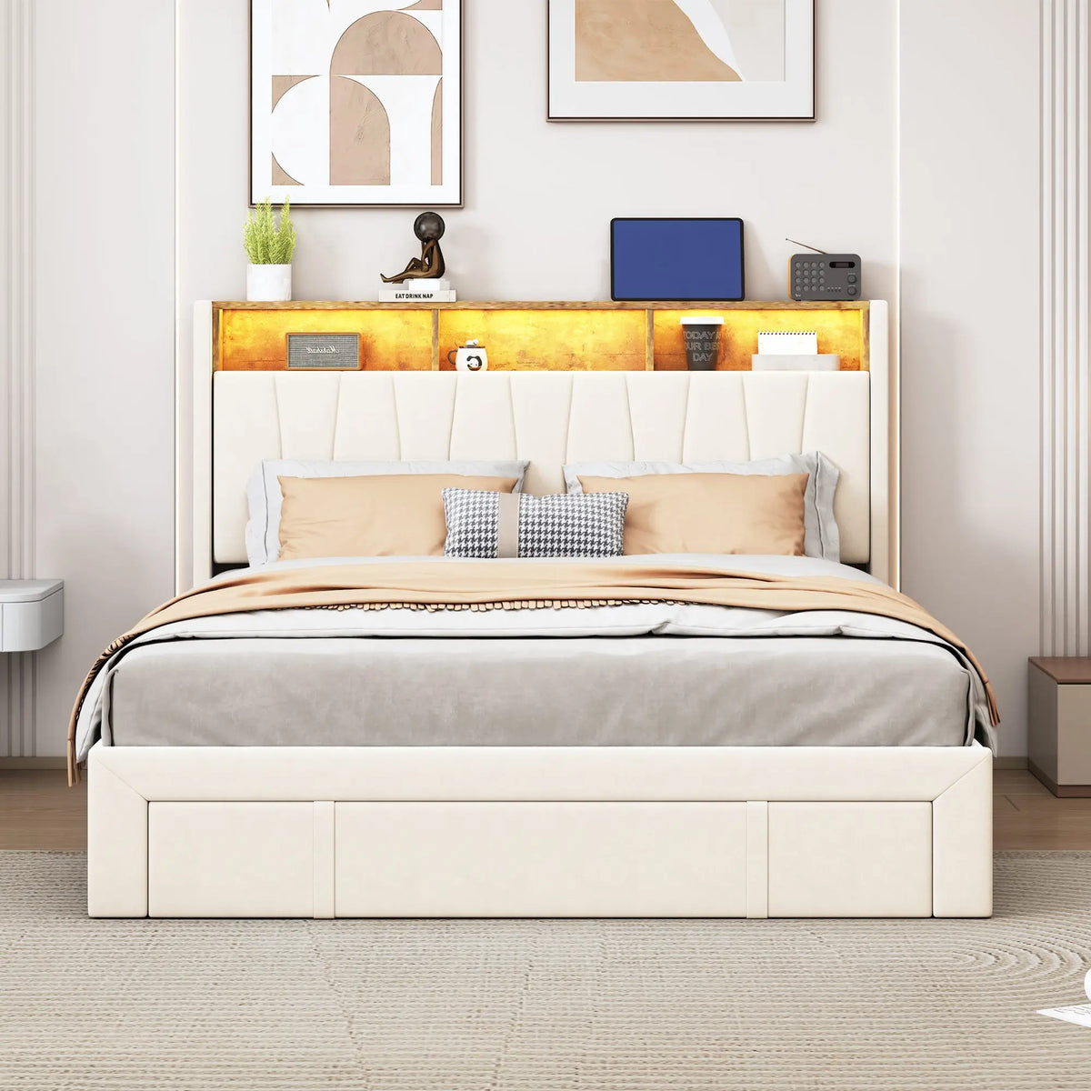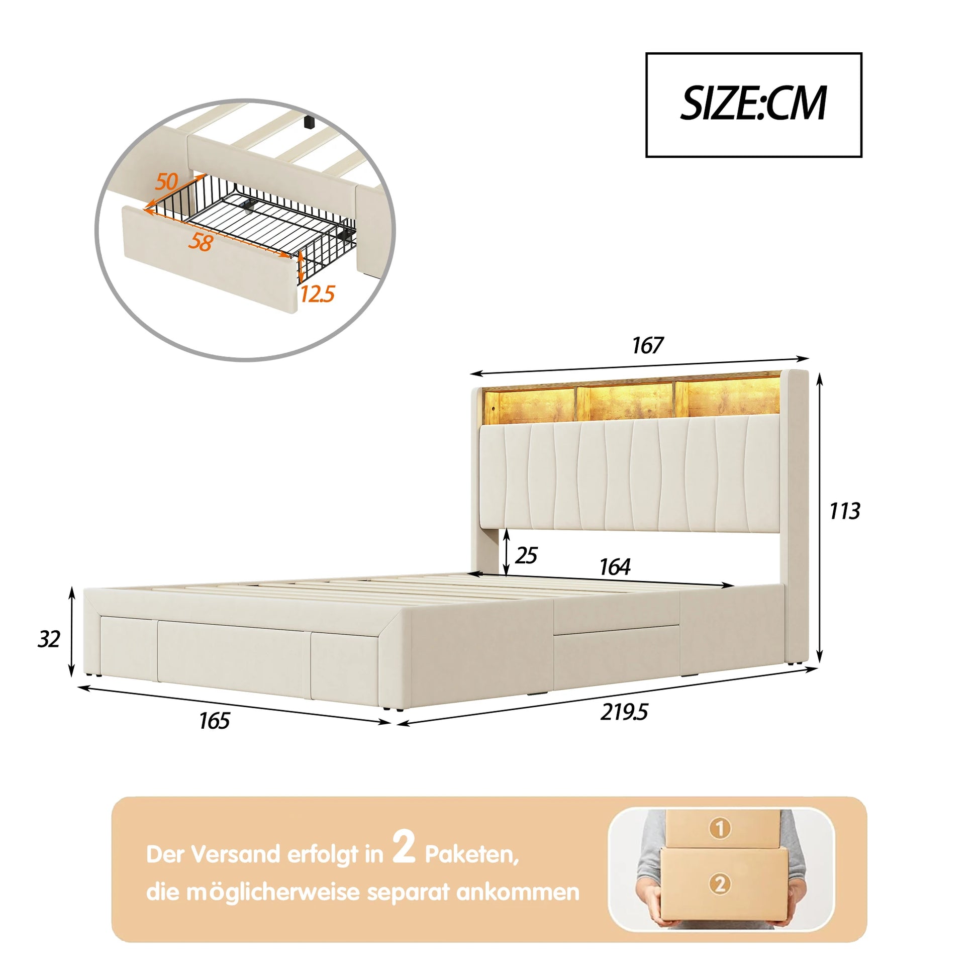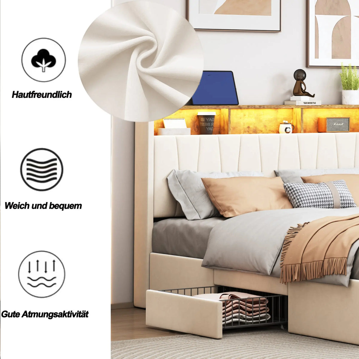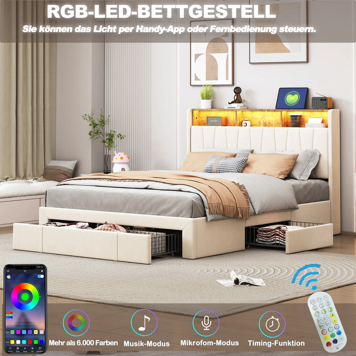 Naslon za glavu sadrži inteligentnu LED traku za osvjetljenje koju možete prilagoditi daljinskim upravljačem kako bi odgovarala bilo kojem raspoloženju—romantičnim večerima, mirnom čitanju ili jakom radnom osvjetljenju. Ispod kreveta, četiri robusna željezna ladice pružaju dovoljno skrivenog prostora za deke, jastuke ili sezonsku odjeću, držeći vašu sobu urednom i organiziranom. Ugrađeni USB i Type-C priključak za punjenje olakšava napajanje uređaja bez traženja utičnica, pojednostavljujući vašu noćnu rutinu. Robusni okvir kreveta ravnomjerno raspoređuje pritisak tijela, pružajući snažnu podršku i prozračnu udobnost za miran san. Prilagođen za standardni madrac dimenzija 160x200 cm, prilagođava se raznim madracima kako bi stvorio visokokvalitetan, ekskluzivan prostor za spavanje.