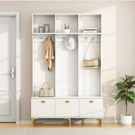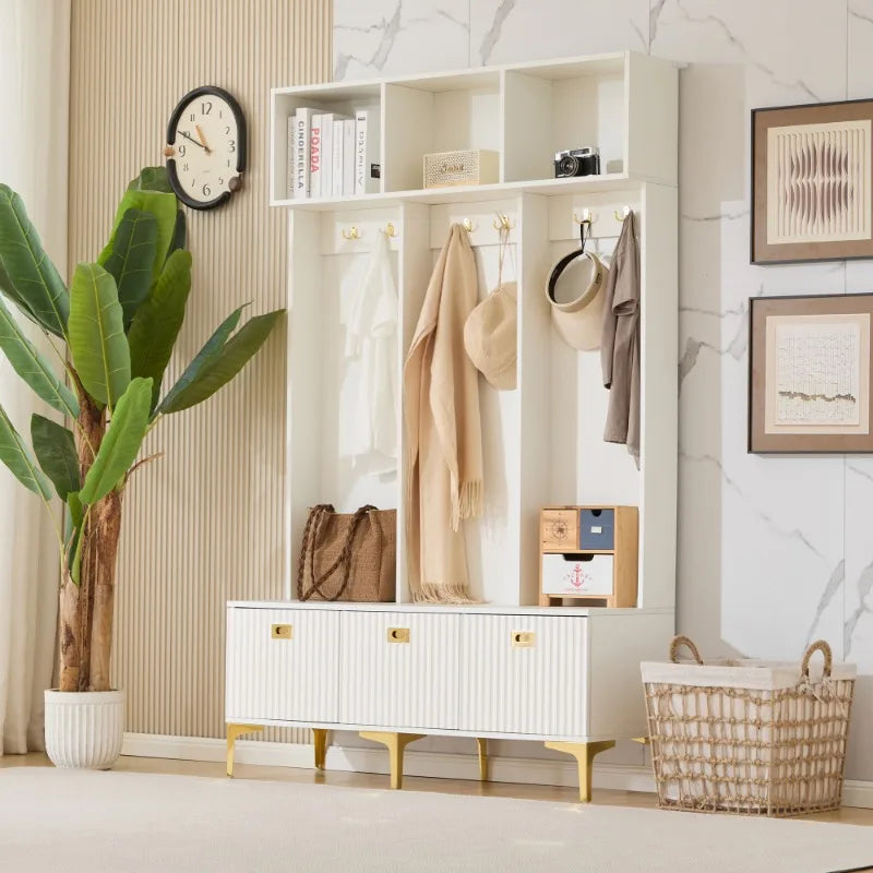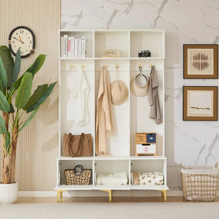 Otkrijte Bijeli ormar set s klupom i šest zlatnih kuka 120 cm — svijetlo, visoko sjajno rješenje za skladištenje u hodniku koje spaja moderni stil s praktičnom organizacijom. Ova svestrana jedinica funkcionira kao vješalica za kapute, skladište za cipele i ormar, sve u jednom kompaktnom dizajnu. Bijela završna obrada s utorima na vratima i šest sjajnih zlatnih kuka, ručki i nogu dodaje dašak luksuza svakom ulazu dok drži svakodnevne potrepštine uredno pri ruci.