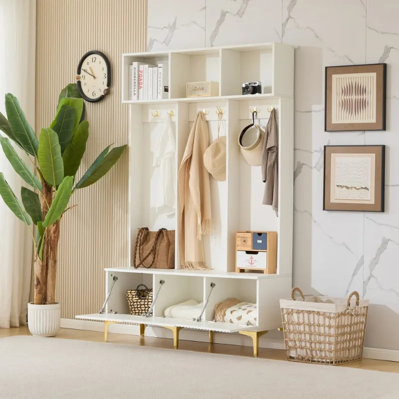 - Besprijekorna organizacija: Kombinira vješalicu za kapute, skladište za cipele i više odjeljaka u jednom komadu kako bi smanjila nered u hodniku.