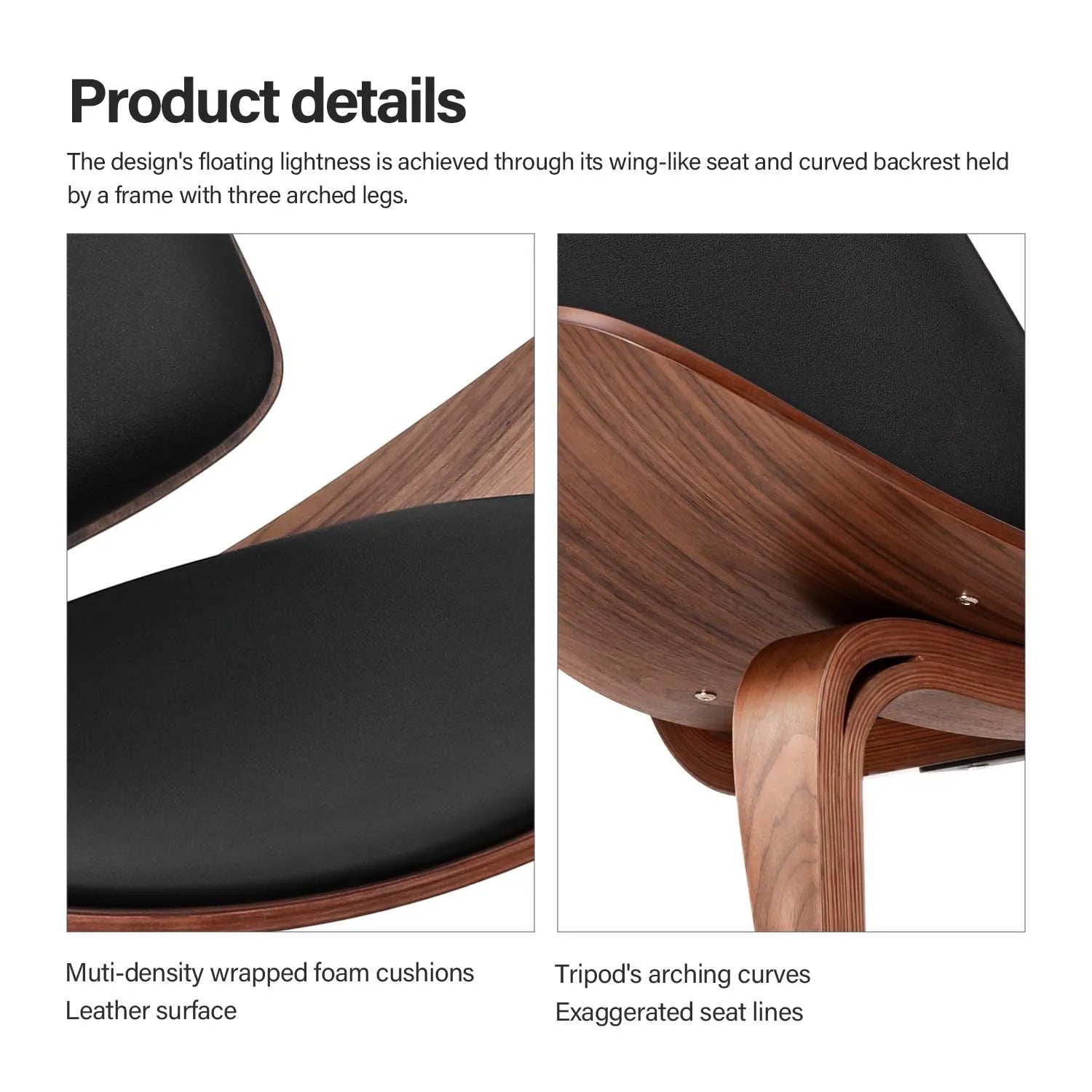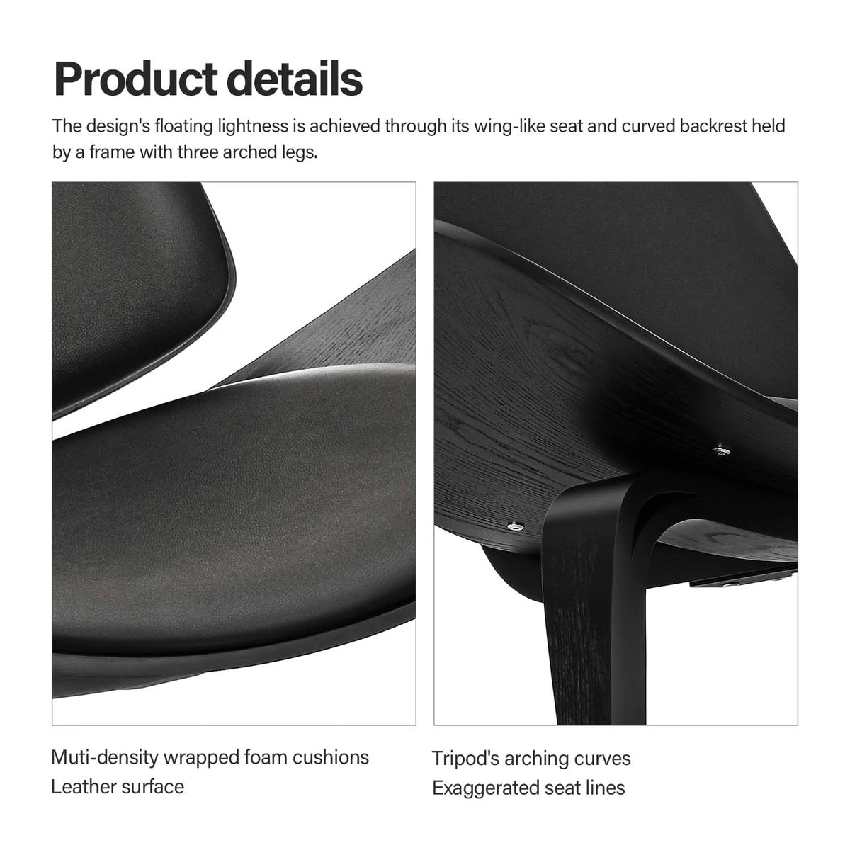 Iskusite šarm sredine stoljeća s Wegner stilom stolice s tri noge u crnom brezinom šperploči. Ovaj moderni komad stvara snažnu izjavu spajajući elegantnu školjku od brezinog šperploče s čvrstom drvenom trokutastom bazom, donoseći bezvremenski stil u vašu dnevnu sobu, spavaću sobu ili kućni ured. Dizajn s tri noge pruža stabilnu podršku dok održava laganu, prozračnu siluetu koja se besprijekorno uklapa u svaki dekor.