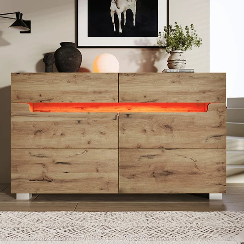 Predstavljamo drveni komodu s 6 ladica, LED rasvjetom i kontrolom putem aplikacije od Jugacool — stylish, funkcionalna središnja točka za moderne životne prostore. Ovaj samostalni ormar za dnevni boravak spaja tople drvene tonove s suvremenom LED rasvjetom i inteligentnom kontrolom putem aplikacije, pružajući vam beznaporno ambijentalno osvjetljenje i organizirano skladištenje u jednoj elegantnoj jedinici. Šest prostranih ladica drži daljinske upravljače, dokumente, posteljinu i druge potrepštine uredno pohranjene, dok integrirana rasvjeta dodaje meki, prilagodljivi sjaj za filmske večeri, večere ili mirne večeri kod kuće.