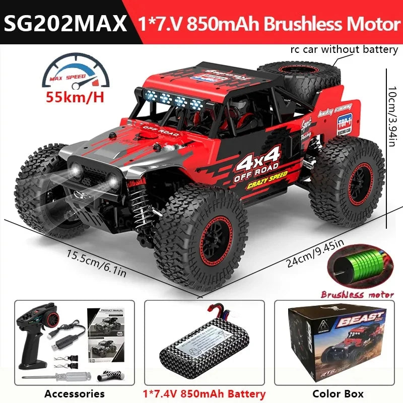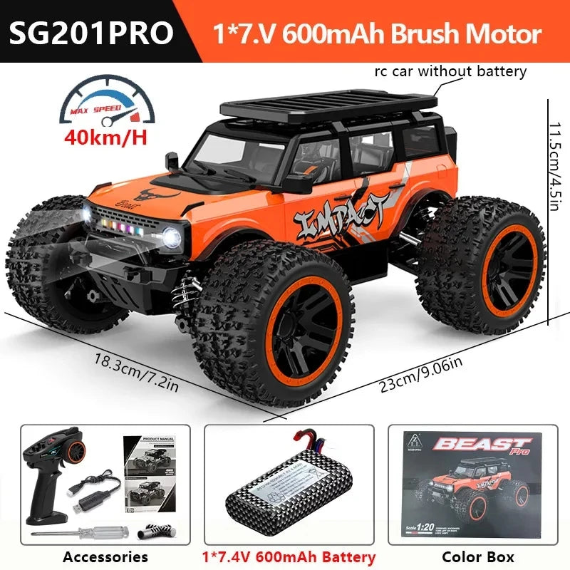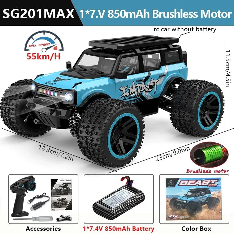 Vivi l'azione off-road adrenalinica con il 1:20 4WD RC Car 55km/h LED Off-Road Brushless Monster Truck. Questo veicolo pronto all'uso in scala 1:20 combina robusta durabilità con potenza brushless ad alta velocità e controllo preciso tramite un telecomando 2.4GHz. Scegli tra i modelli brushless MAX (SG201 MAX, SG202 MAX) che raggiungono fino a 55 km/h, o i modelli PRO a spazzola di carbonio (SG201 PRO, SG202 PRO) che raggiungono fino a 40 km/h per un'opzione più resistente e durevole. Il camion presenta sospensioni indipendenti, elettronica splashproof, illuminazione LED brillante e dettagli autentici in metallo che ti danno un vantaggio competitivo su terra, erba, ghiaia e rampe. Include una batteria ricaricabile LiPo 7.4V e caricatore USB per sessioni rapide, e il telecomando 2.4GHz permette a più veicoli di gareggiare insieme senza interferenze, con un raggio pratico del telecomando fino a circa 80–90 metri a seconda della versione.