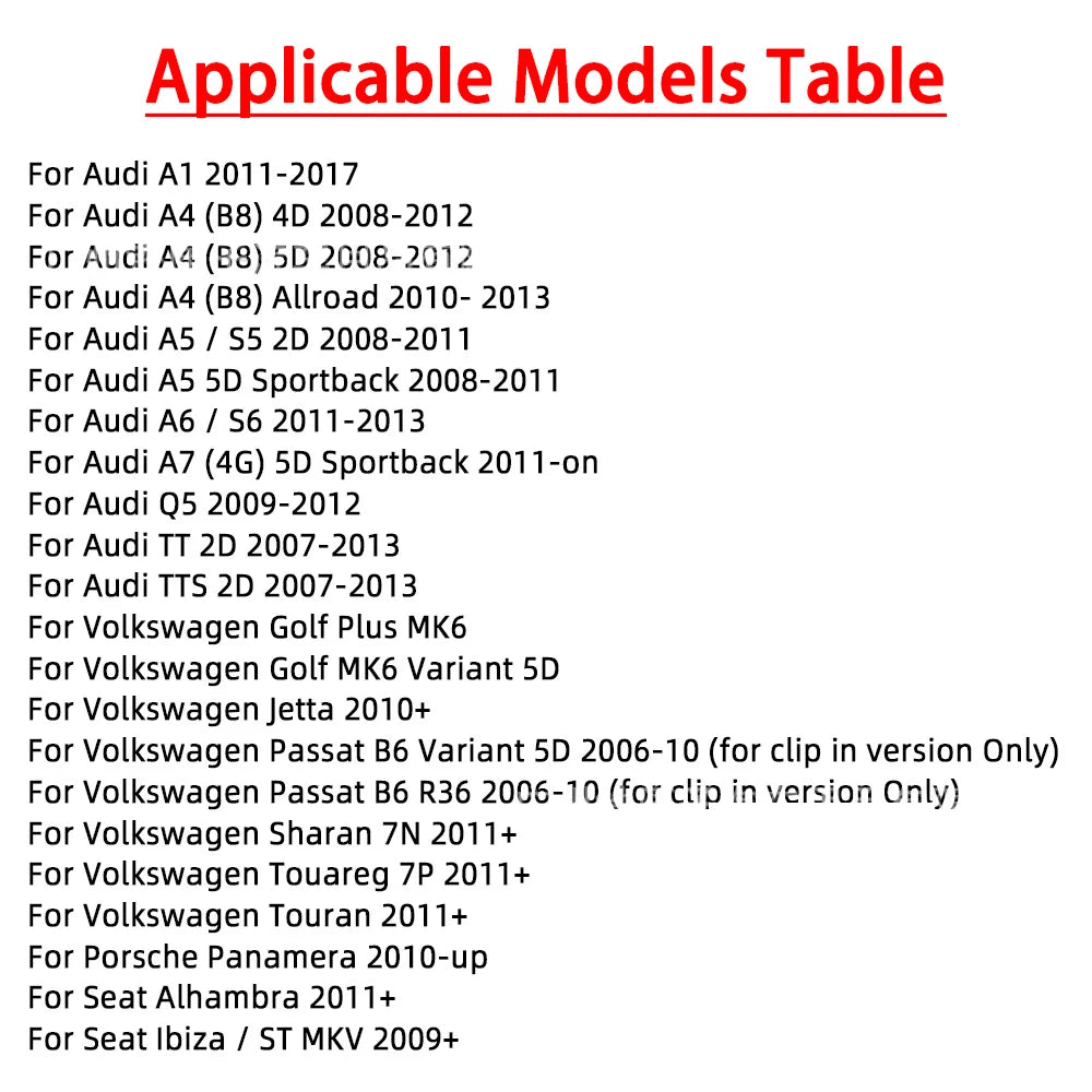 I modelli compatibili includono Audi A1 (2011-2017), A4 (B8) 4D & 5D (2008-2012), Allroad (2010-2013), A5/S5 2D (2008-2011), A5 5D Sportback (2008-2011), A6/S6 (2011-2013), Q5 (2009-2012), TT (2007-2013) e TTS (2007-2013). Si adattano anche a una varietà di modelli VW, Porsche e Seat come Golf Plus MK6, Golf MK6 Variant 5D, Jetta (2010+), Passat B6 Variant 5D (versione clip-in), Passat B6 R36 (clip-in), Sharan 7N (2011+), Touareg 7P (2011+), Touran (2011+), Panamera (2010+), Seat Alhambra (2011+) e Seat Ibiza/ST MKV (2009+).