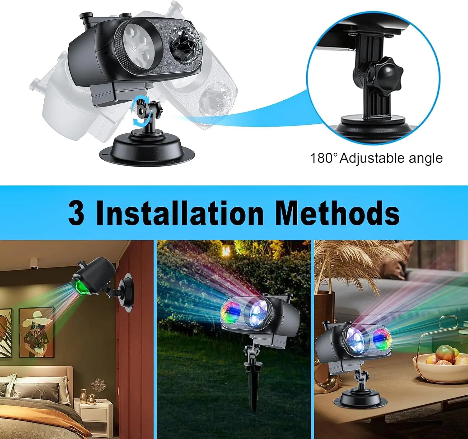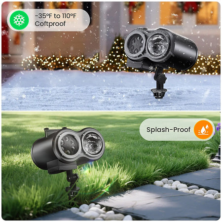Progettato per l'uso tutto l'anno, questo proiettore è costruito per funzionare in condizioni climatiche variabili. Opera a temperature da -35°F a 110°F e dispone di protezione splash‑proof, rendendolo adatto per posizionamenti esterni in pioggia leggera o ambienti umidi. La base rotonda per interni, i picchetti per esterni o il montaggio a parete con viti offrono un'installazione flessibile per adattarsi a qualsiasi spazio—da soggiorni e camere da letto a patii e giardini.