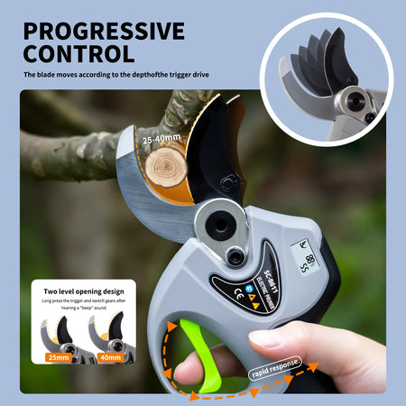 Il potatore cordless da 21V con taglio da 40 mm, motore senza spazzole e lama in tungsteno di OLOEY è progettato per potature sicure con la comodità del cordless. Goditi tagli lisci ed efficienti grazie a un motore senza spazzole che dura più a lungo e rimane più fresco durante un uso intenso. La lama in tungsteno offre prestazioni durevoli e affilate per la potatura regolare di piccoli rami fino a 40 mm, aiutandoti a mantenere piante sane, alberi da frutto e siepi con meno sforzo. Con un'apertura da 0 a 40 mm, puoi controllare ogni taglio per risultati puliti e precisi. Questo modello è progettato per un uso prolungato con una potente batteria da 21V e offre un tempo di lavoro pratico a piena potenza di 6-9 ore per permetterti di potare più a lungo tra le ricariche.
