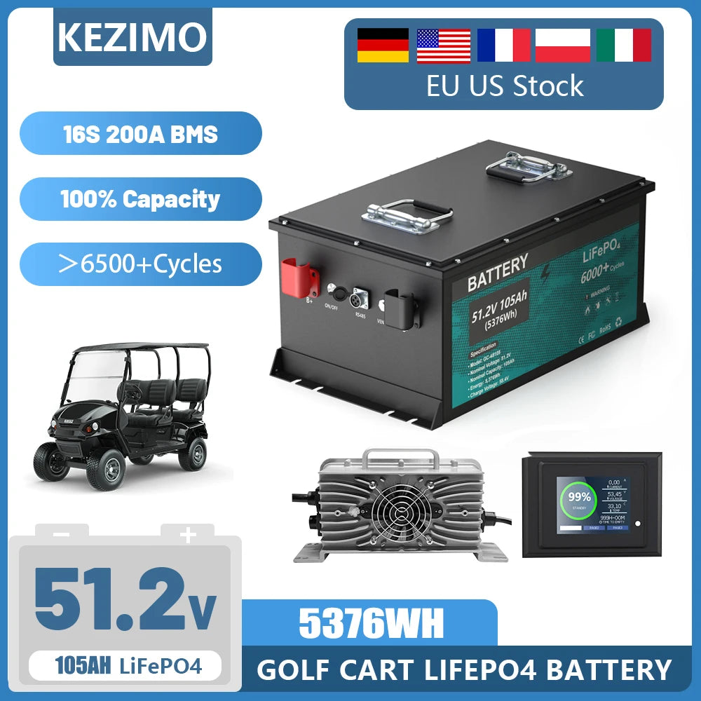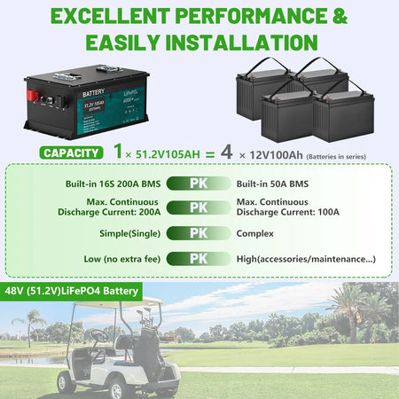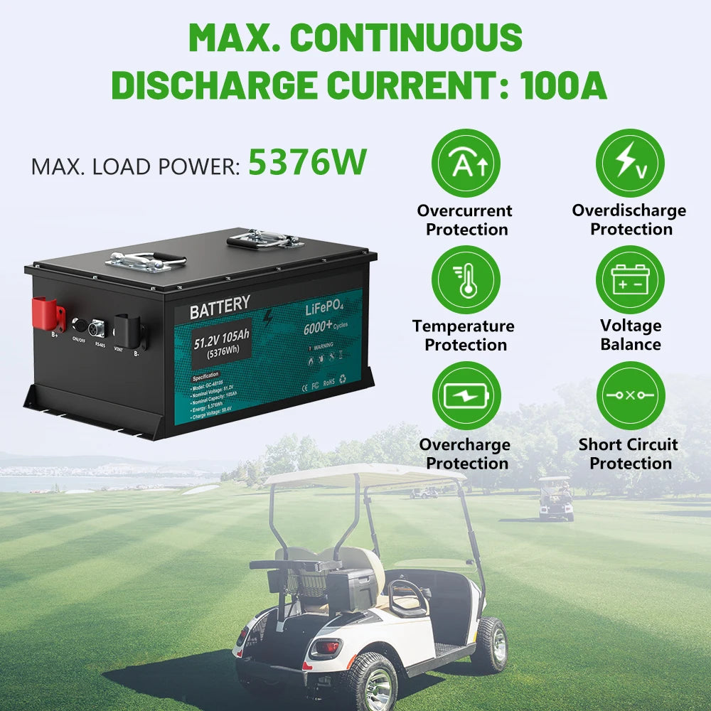 Aggiorna il tuo golf cart con la batteria LiFePO4 da 48V 105Ah con BMS intelligente integrato e caricatore con monitor touch. Questa batteria LiFePO4 ad alte prestazioni è progettata per sostituire i pacchi al piombo, offrendo un'accelerazione più potente, una coppia più fluida e una potenza affidabile sul green. Con un'energia nominale di 5 kWh e una tensione compatta di 51,2V, puoi contare su prestazioni costanti per tutto il giro.