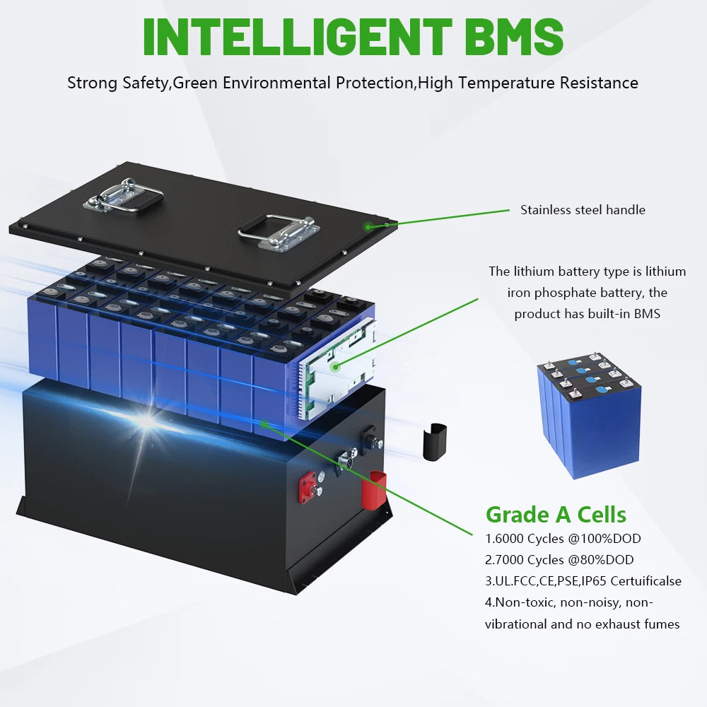 - BMS: BMS 200A integrato con protezioni da sovraccarico/scarica, sovracorrente, alta/bassa temperatura e cortocircuito
