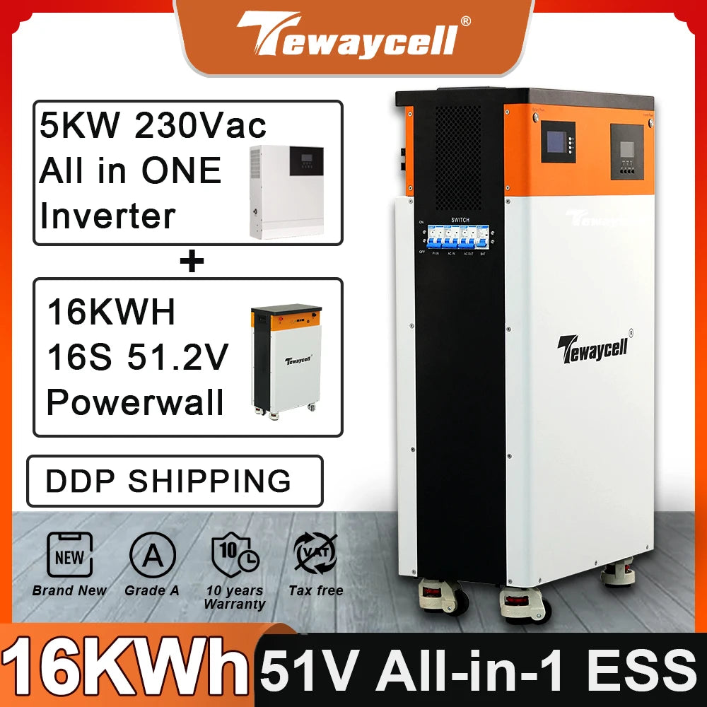 Tewaycell 48V 15kWh LiFePO4 Powerwall Pacco Batteria Con Inverter Integrato 5kW 230V WiFi MPPT ESS Sistema Solare Domestico