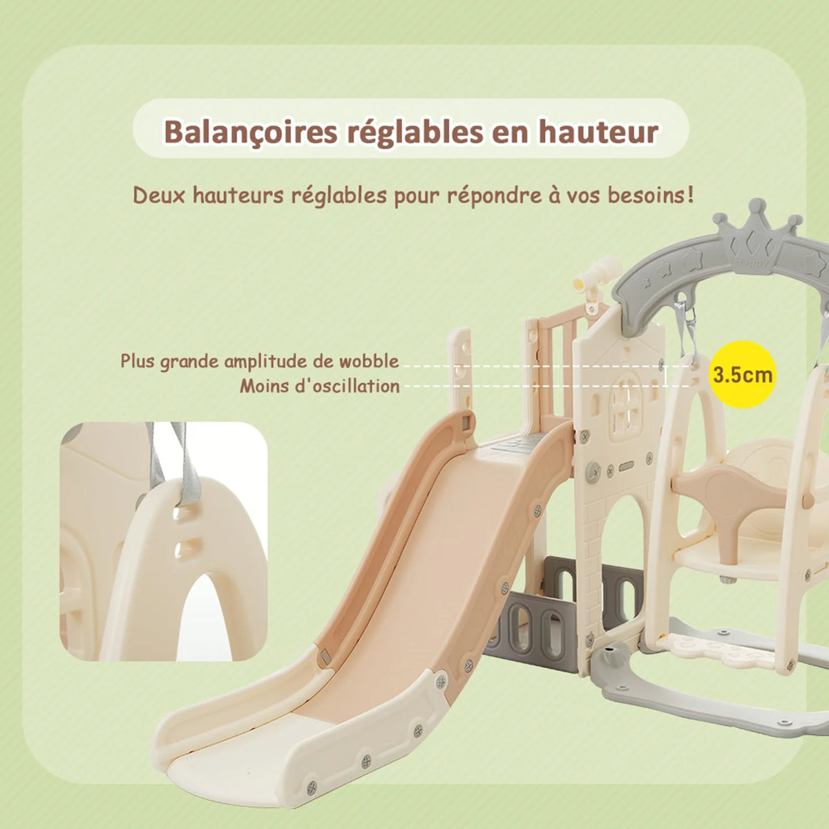Realizzato in HDPE ecologico, questo set è robusto, resistente alle intemperie e facile da pulire. La finitura marrone caldo e bianco antico aggiunge un aspetto amichevole e invitante a qualsiasi stanza da gioco, giardino o patio. La sicurezza è una priorità: strutture antiscivolo per le scale, robuste ringhiere, scivoli estesi e restrizioni per l'altalena aiutano a proteggere i piccoli esploratori durante ogni attività.