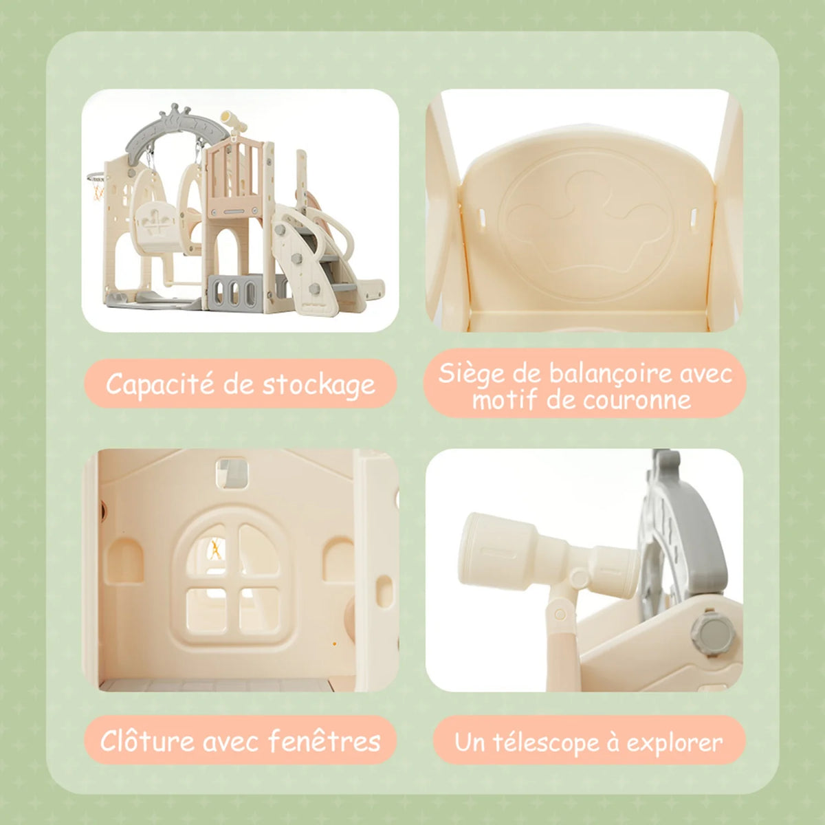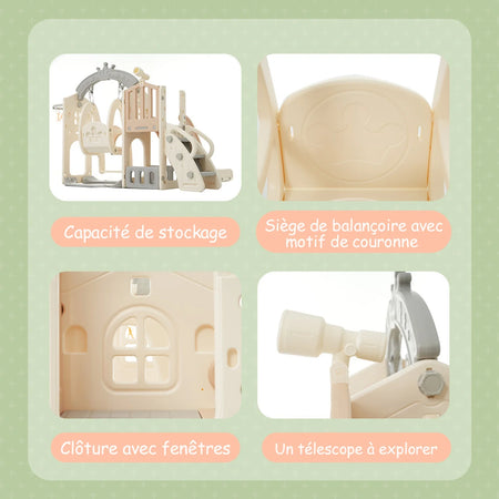 - Usa il telescopio e le aree di arrampicata per incoraggiare il gioco attivo, la coordinazione e il gioco di ruolo immaginativo durante il tempo di gioco in famiglia.