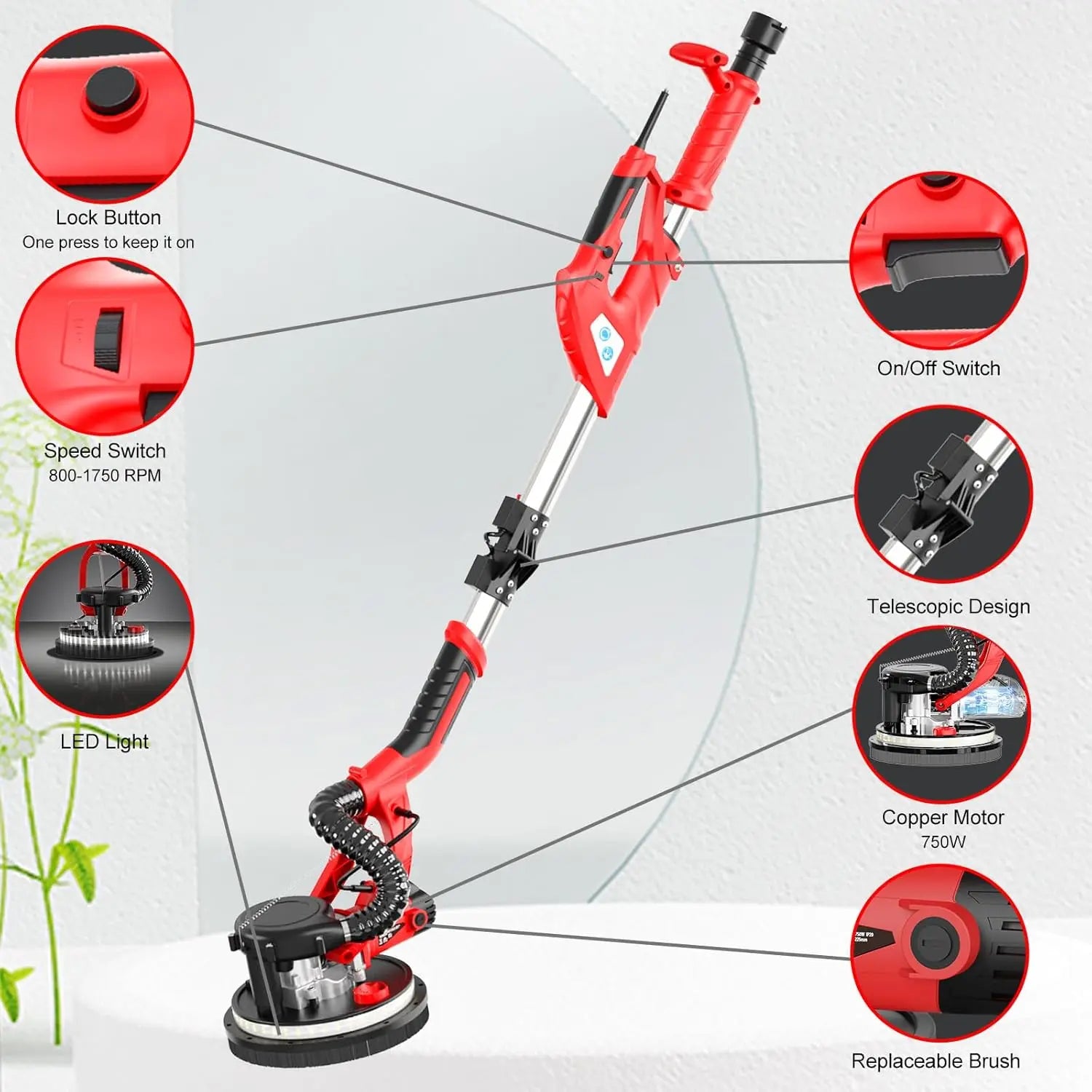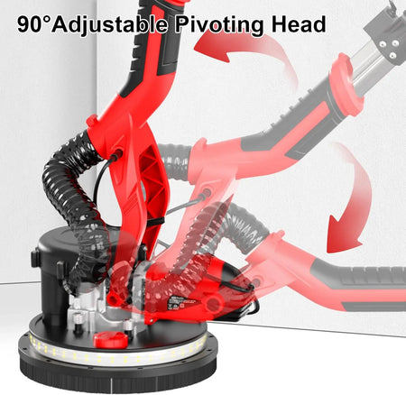 Progettata per visibilità e versatilità, la testa include strisce LED morbide e uniformi per illuminare gli angoli bui, rendendo il lavoro di dettaglio più facile e preciso. Gli angoli staccabili affinano la levigatura dei bordi, mentre un'interfaccia universale per aspirapolvere si collega alla maggior parte degli aspirapolvere domestici per una migliore rimozione della polvere. Il manico pieghevole e l'asta estensibile (da 1,2 m a 1,7 m) offrono un'eccezionale portata e comfort ergonomico, permettendoti di lavorare in piedi su pareti o soffitti alti senza sforzo.