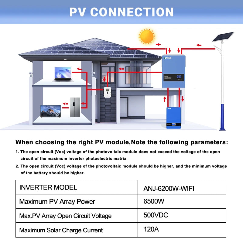 Inverter solare ibrido Anenji 6.2KW 48V con ingresso PV 500VDC, onda sinusoidale pura MPPT 120A e WiFi integrato