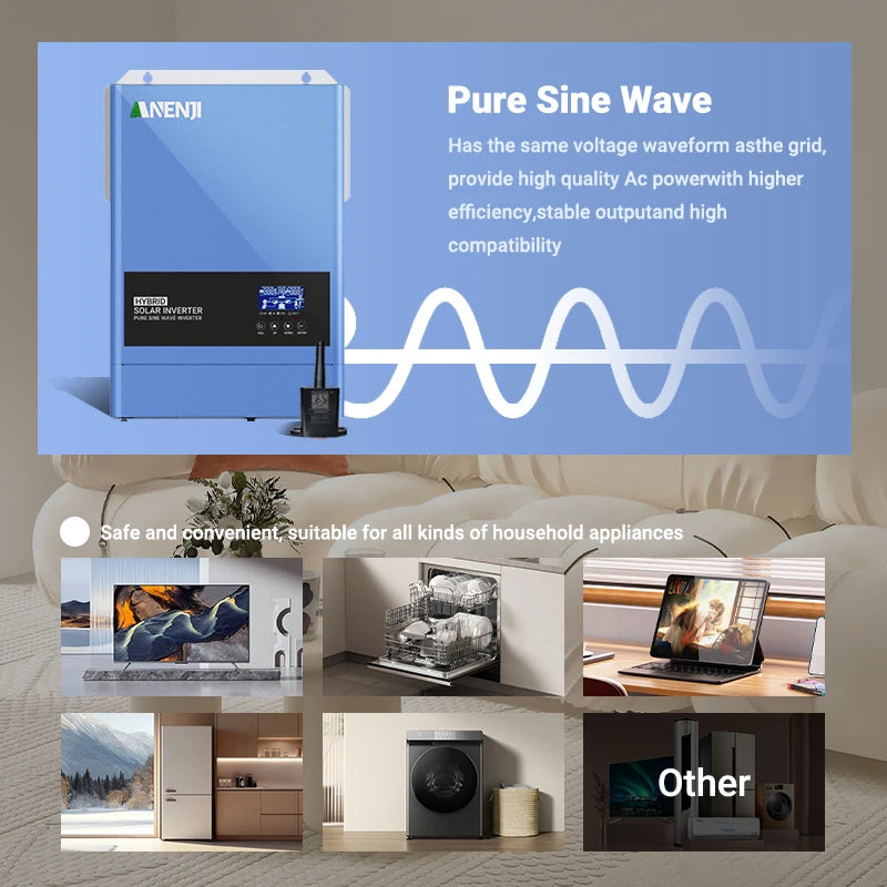 Presentiamo l'Anenji ANJ-6200W-48V-WIFI, un inverter solare ibrido da 6,2 kW progettato per alimentare case e piccole imprese con affidabilità e flessibilità. Questa unità fornisce un'onda sinusoidale pura con un fattore di potenza di 1,0, garantendo che i tuoi apparecchi funzionino in modo fluido ed efficiente. Con un ampio intervallo di ingresso PV da 60 Vdc a 500 Vdc e un MPPT integrato da 120 A, otterrai un rapido ed efficiente sfruttamento dell'energia dal tuo impianto solare.