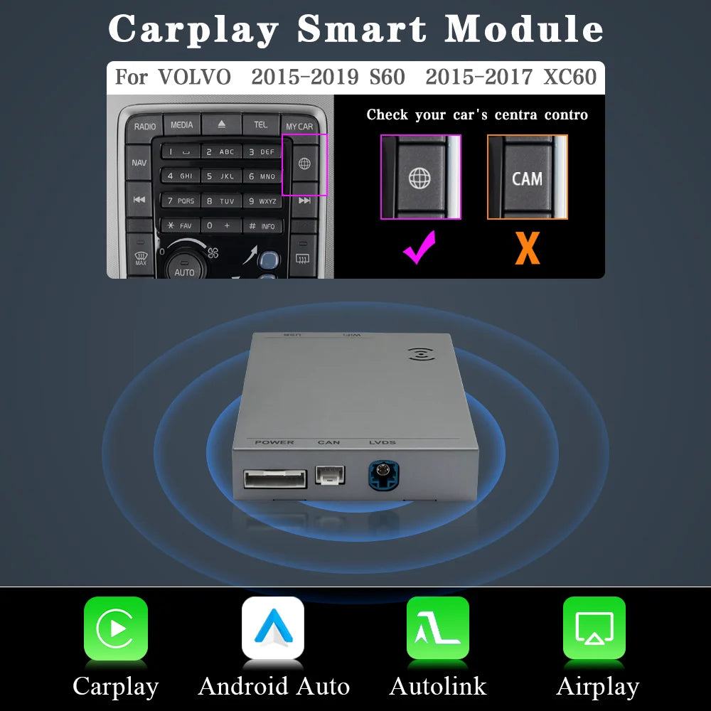 Kit CarPlay Android Auto Wireless per Aggiornamento Infotainment Volvo S60 Modulo Plug and Play