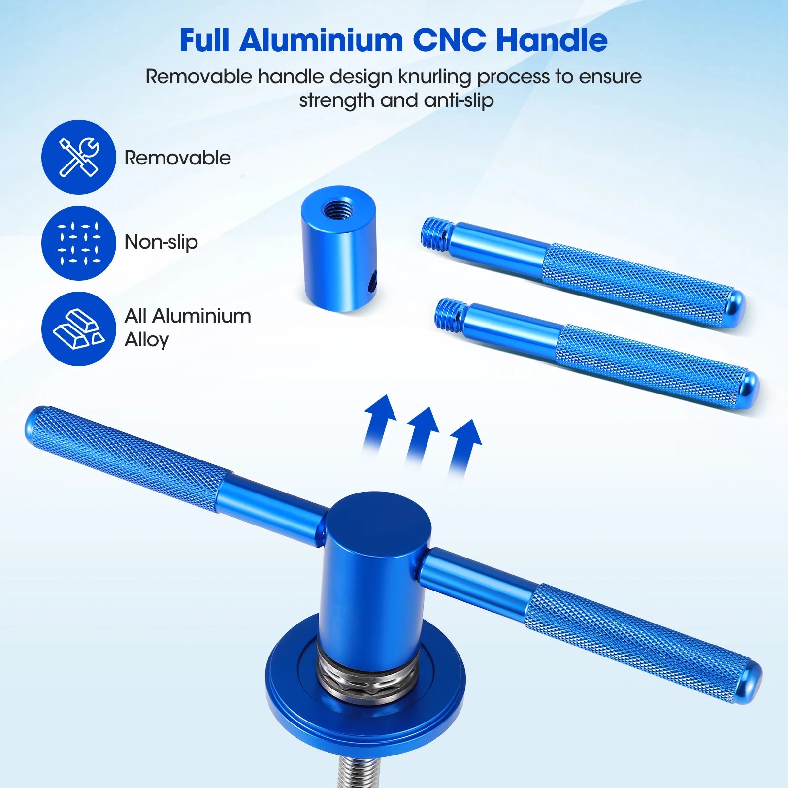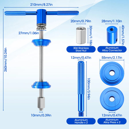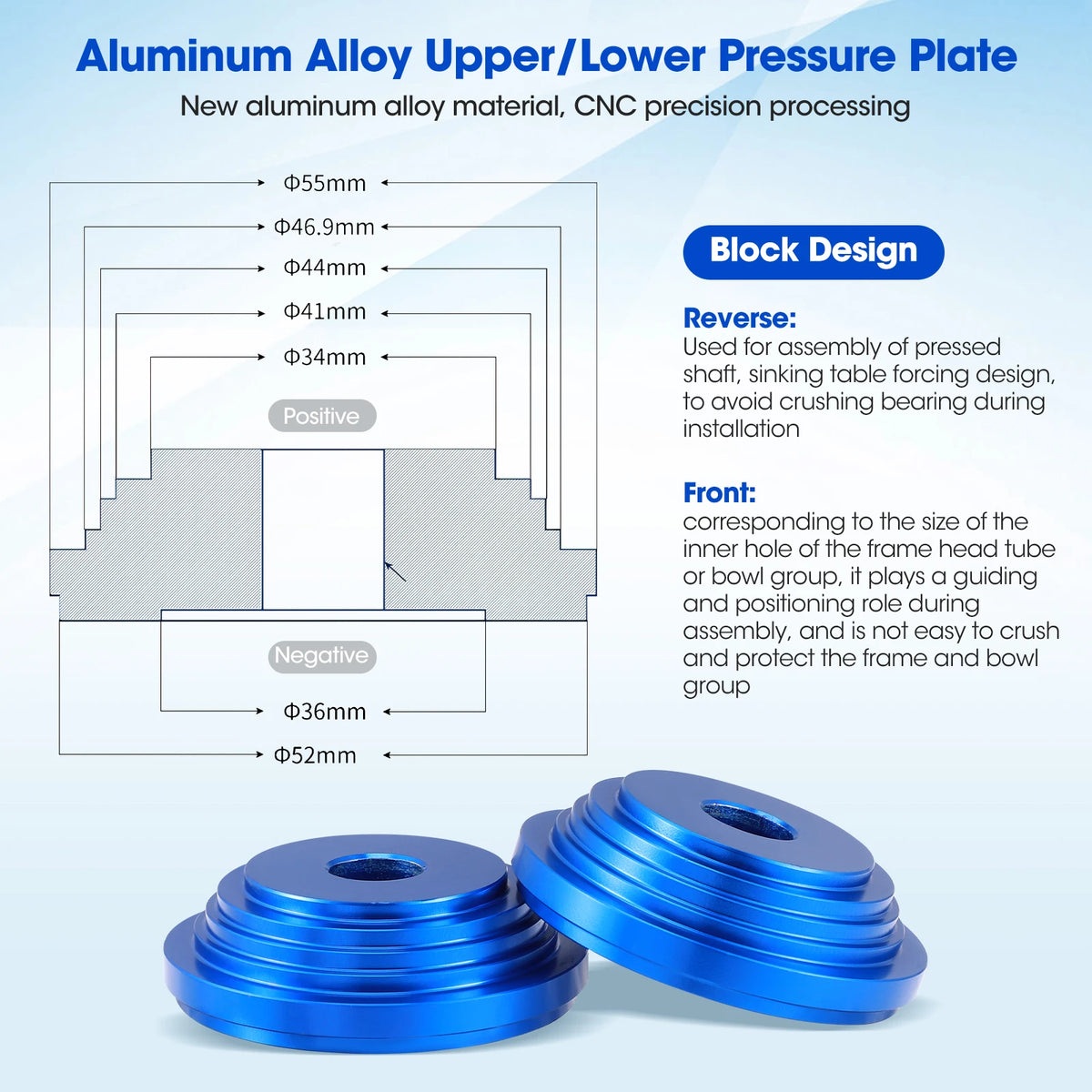 Scopri il Kit Attrezzo per Serie Sterzo e Movimento Centrale Jugacool, un attrezzo a pressione di precisione progettato per installare e rimuovere cuscinetti di serie sterzo e movimenti centrali con affidabilità e facilità. Realizzato in lega di alluminio e acciaio inossidabile 304, questo attrezzo resiste alla ruggine e offre alta resistenza per prestazioni durature innumerevoli uscite. La sua filettatura fine e la presa zigrinata garantiscono una calzata sicura e precisa per la maggior parte delle lunghezze di tubo sterzo, mentre la superficie di spinta piatta e l'ampia versatilità mantengono l'attrezzo compatibile con un'ampia gamma di configurazioni. Il design innovativo del blocco di pressatura assicura che la parte posteriore permetta l'installazione fluida dei cuscinetti con incavo, e la piattaforma incassata evita la pressione sui cuscinetti durante l'installazione. Il cuscinetto utilizza una sfera lubrificante per ridurre lo sforzo e prevenire l'incollaggio durante le pressature. Adatto a varie specifiche di albero BB press-fit, si prega di confermare se la tua bicicletta è adatta ai nostri prodotti prima dell'acquisto. Dimensioni: circa 210 mm x 260 mm. Incluso 1 x attrezzo di installazione.