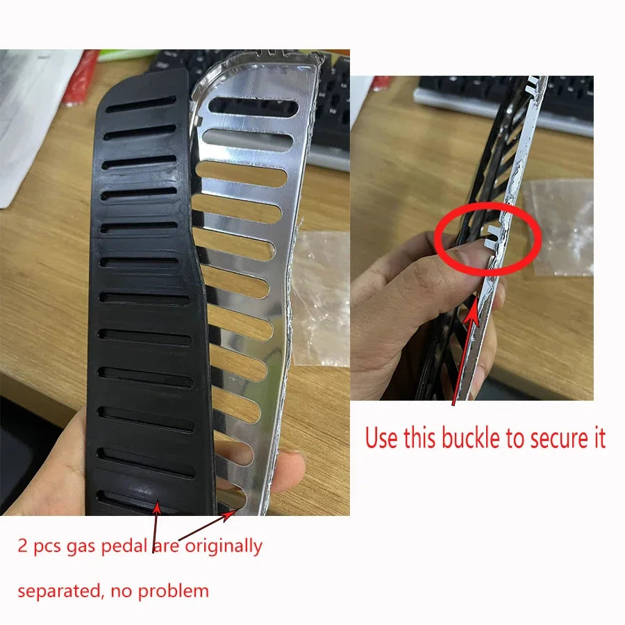L'installazione è semplice e non richiede forature o saldature. Le coperture si infilano sopra i pedali esistenti dopo aver rimosso la gomma originale dove necessario. Questo aggiornamento fai-da-te fornisce una superficie antiscivolo per un'accelerazione, una frenata e un uso del poggiapiedi sicuri, anche in condizioni di bagnato. Con una finitura in acciaio elegante e una costruzione durevole, sono progettate per resistere all'uso quotidiano mantenendo l'estetica interna della tua auto.