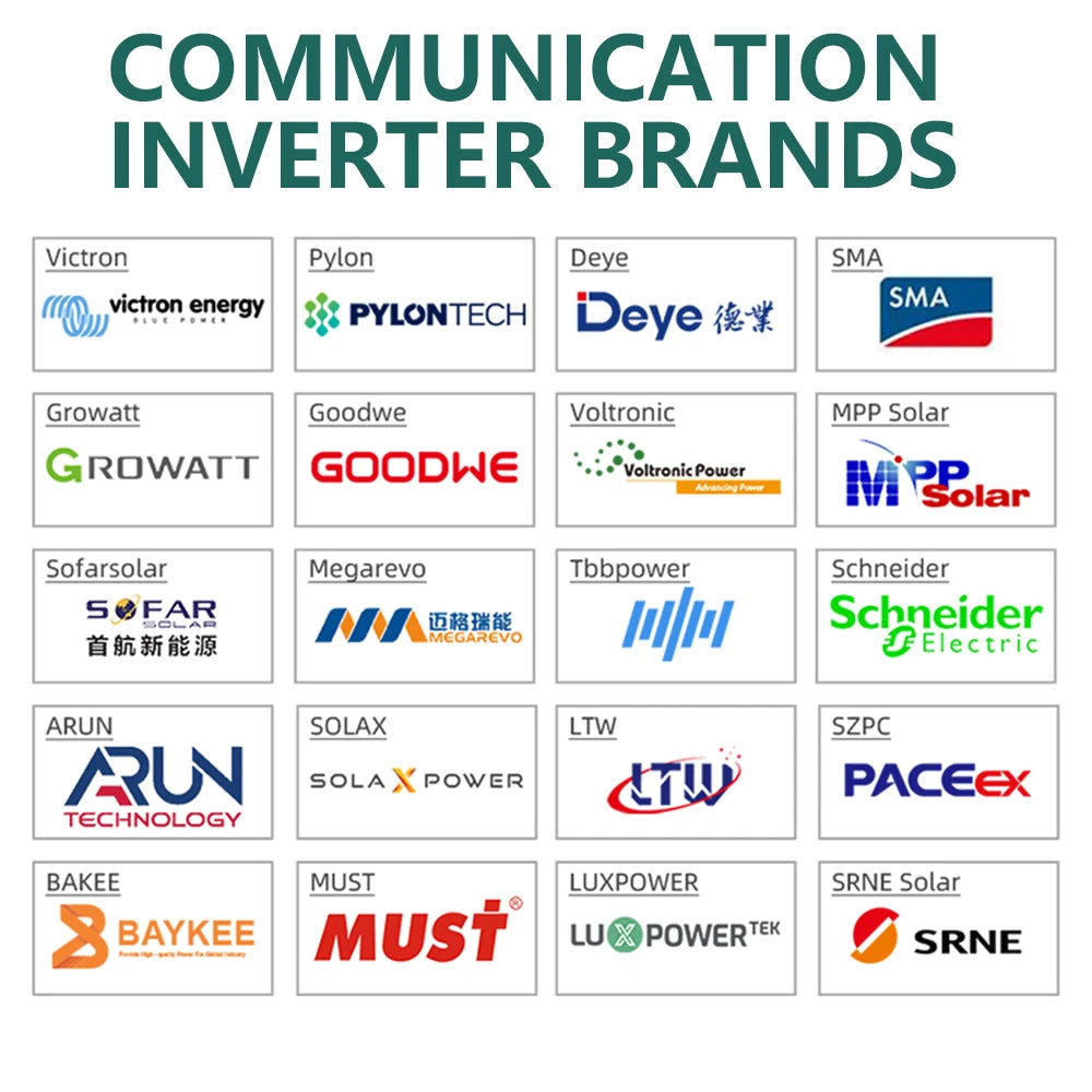 - Compatibilità inverter: Growatt, Deye, GoodWe, Voltronic, Sofar, Victron, EAsun, Megarevo, SRNE, Pylon, Luxpowertek, Sorotec, SMA, GINLONG, MUST, TBB, Studer