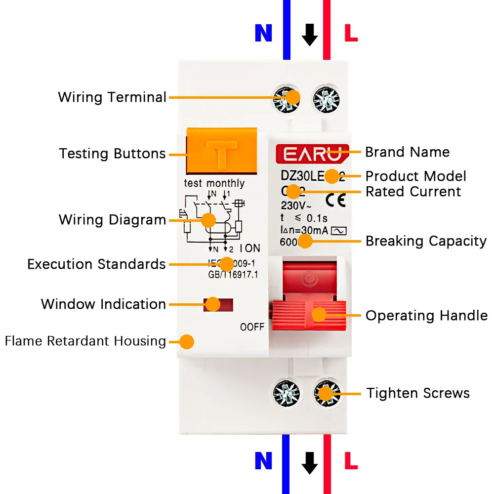 EarueLetric 230V 1P+N RCBO MCB con sovraccarico e protezione del corto circuito, 6-63a