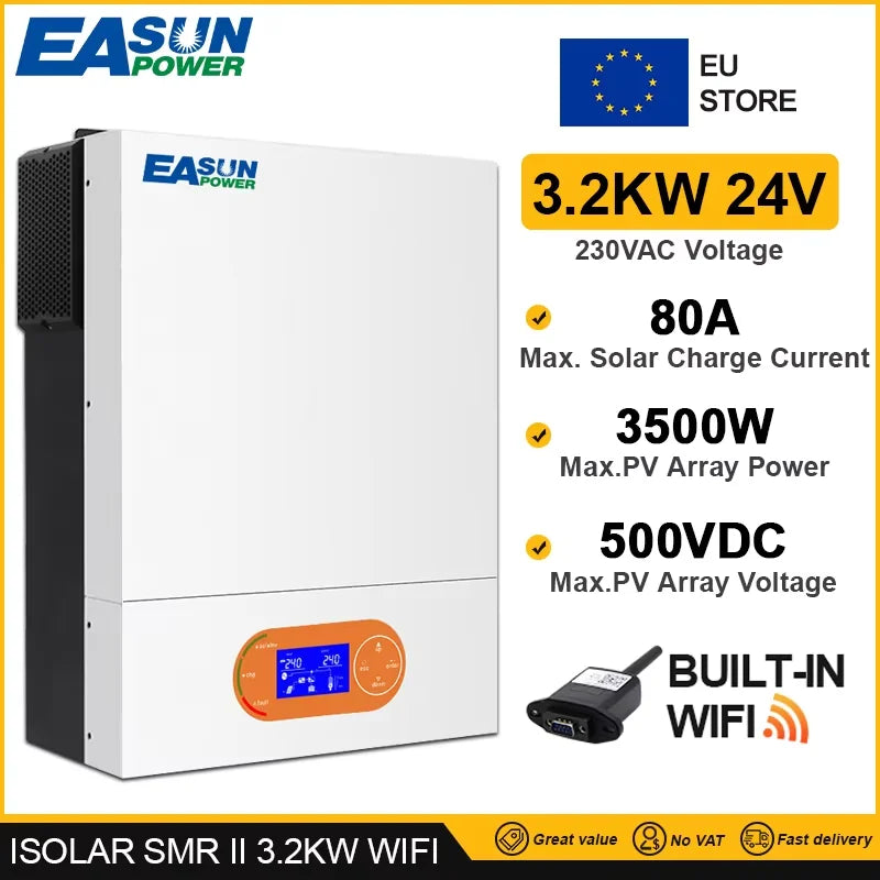 - Isolar SMR II 3.2KW WiFi — Potenza nominale: 3200VA/3200W; Dimensioni: 348x270x95 mm; Peso netto: 5.5 kg