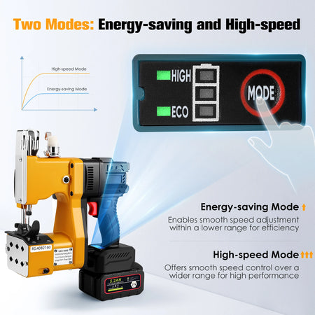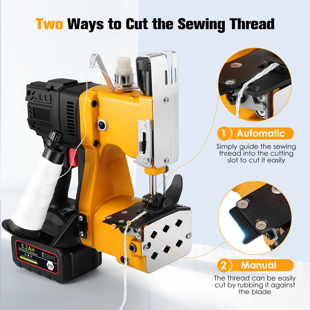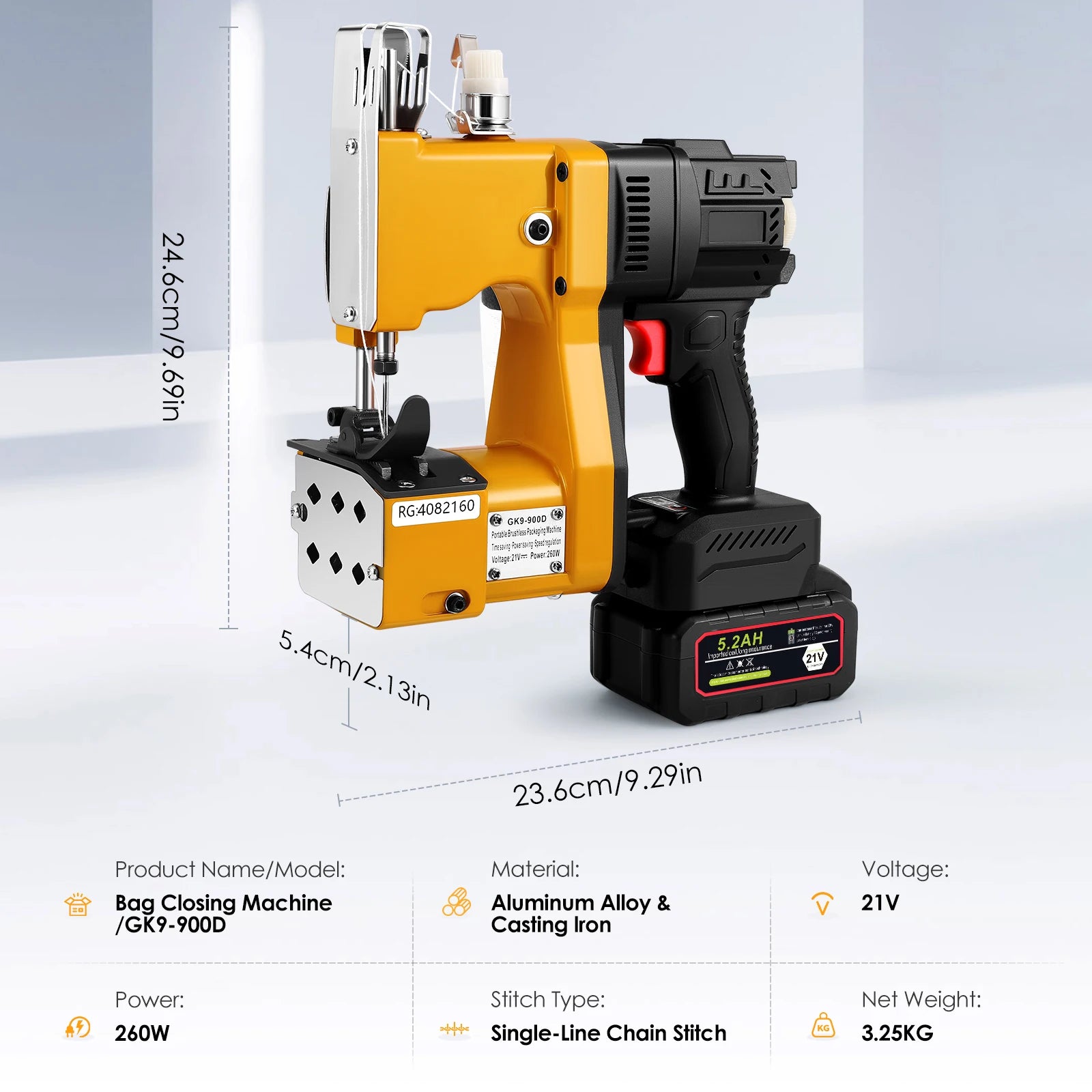Alimentata da una batteria al litio ad alta capacità da 50000mAh, questa macchina per la chiusura dei sacchetti funziona fino a 5 ore in modalità risparmio energetico o 3 ore in modalità ad alta efficienza, perfetta per lavori di sigillatura all'aperto. La sua impugnatura ergonomica isolata offre una presa sicura, mentre il piedino premistoffa e la piastra ago trattati termicamente e lucidati garantiscono un'alimentazione del tessuto fluida. Può cucire attraverso 12 strati di sacchetti tessuti e gestisce facilmente pelle, sacchetti tessuti, iuta, sacchetti di carta kraft e tessuti non tessuti. Tutti i componenti elettronici sono progettati per l'affidabilità in ambienti impegnativi e il dispositivo è costruito per essere durevole e facile da manutenere.