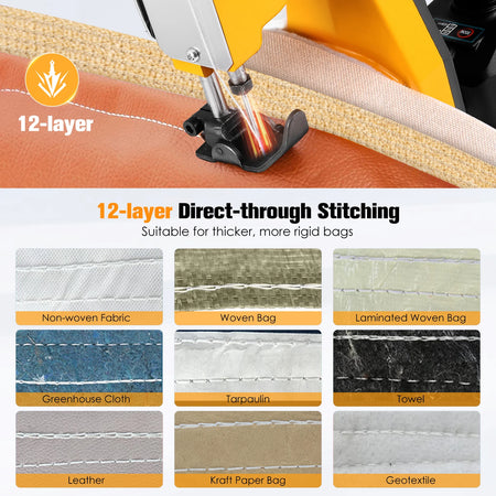 - Cuce fino a 12 strati e supporta una varietà di materiali per borse tra cui pelle, borse tessute, iuta, carta kraft e tessuti non tessuti.