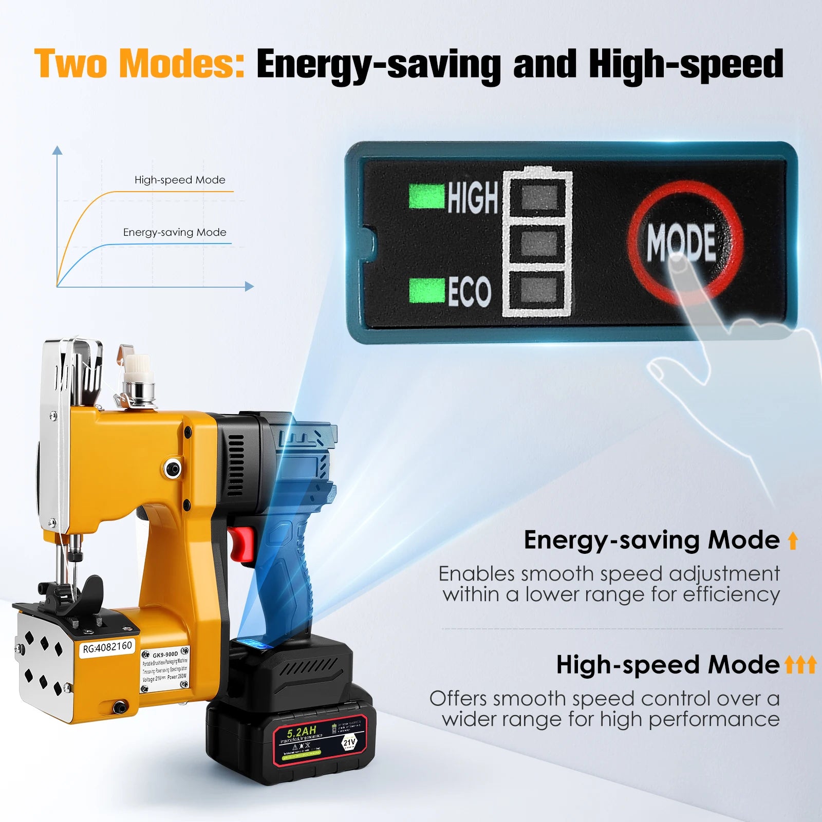 Macchina da cucire elettrica a batteria per sacchetti 50000mAh 21V Brushless è una soluzione portatile per la chiusura dei sacchetti progettata per una sigillatura durevole ed efficiente su un'ampia gamma di materiali per sacchetti. Presenta un motore brushless aggiornato con nucleo completamente in rame e fili di rame spessi per fornire una potenza di 190W per un funzionamento fluido e una vita utile più lunga. Con funzionamento senza fili, una struttura robusta in alluminio e una batteria a lunga durata, è ideale per lavori all'aperto, mercati e officine dove le prese di corrente sono scarse.
