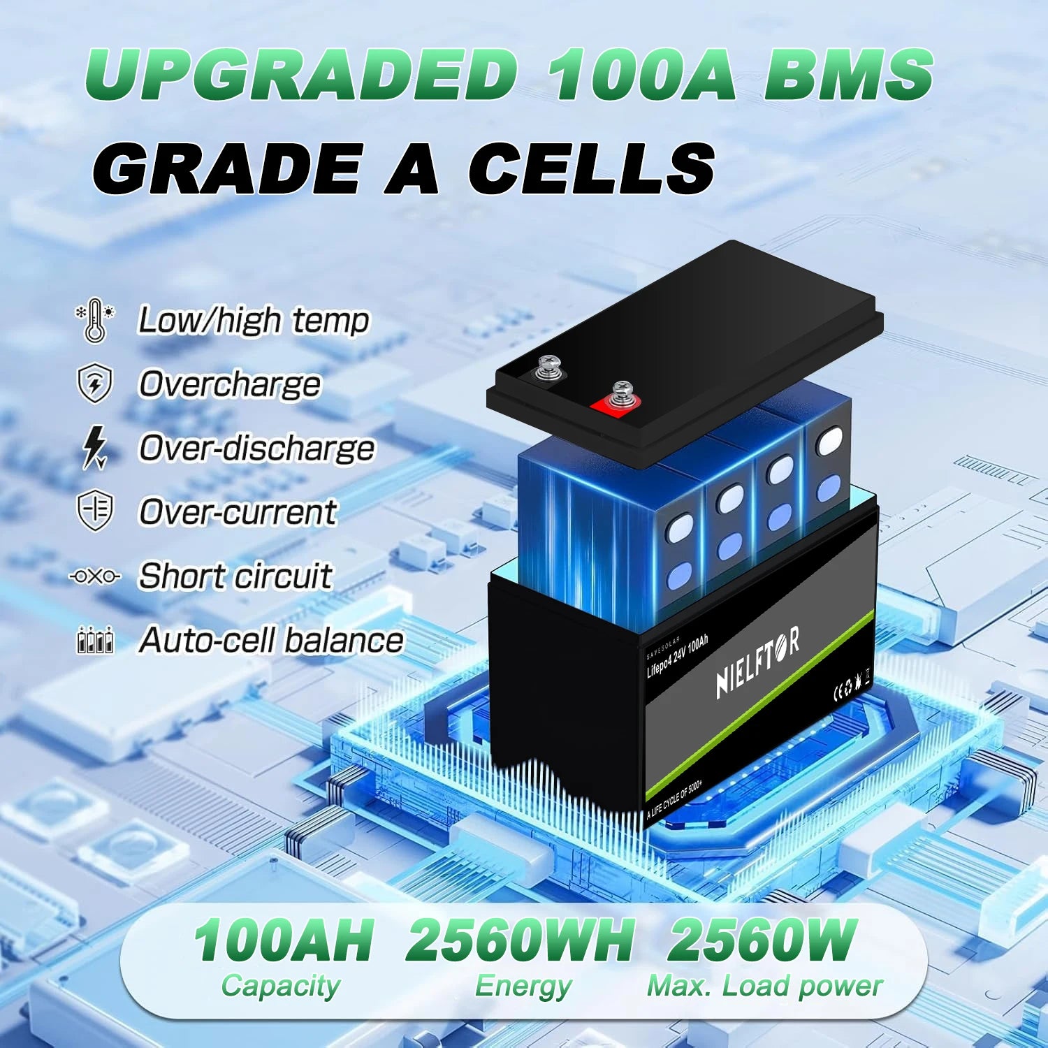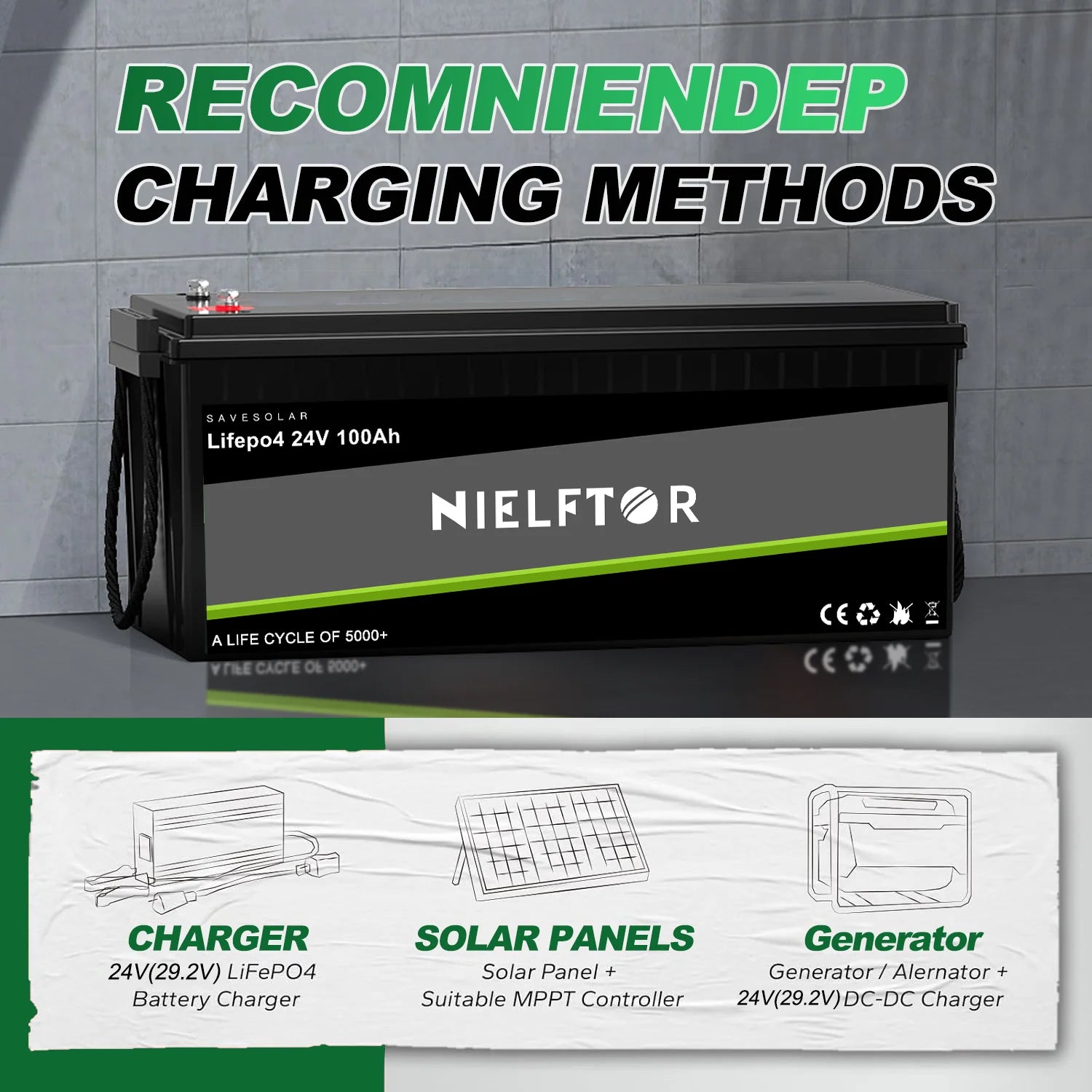 - Supporta 3 metodi di ricarica: ricarica tramite caricabatterie LiFePO4 da 24V (29,2V), pannello solare + controller MPPT, o generatore/alternatore + caricabatterie DC-DC da 24V (29,2V) per una ricarica versatile in loco.