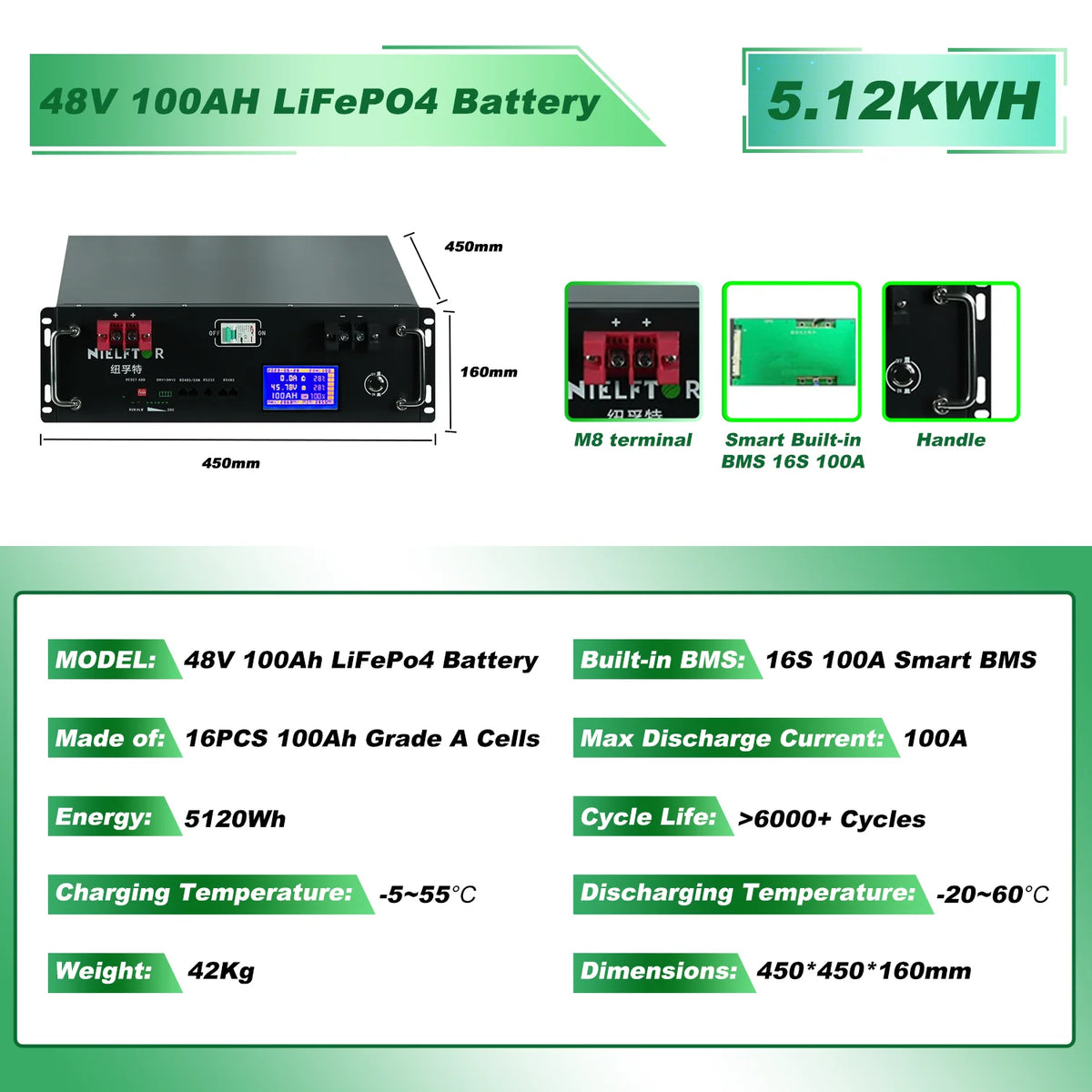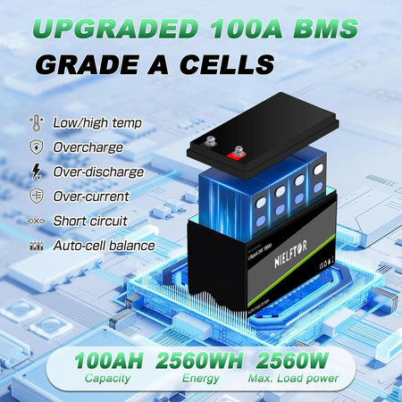 - Lunga durata del ciclo e alta sicurezza: la chimica LiFePO4 offre migliaia di cicli di carica/scarica con prestazioni stabili, ideale per camper, barche e accumulo solare.