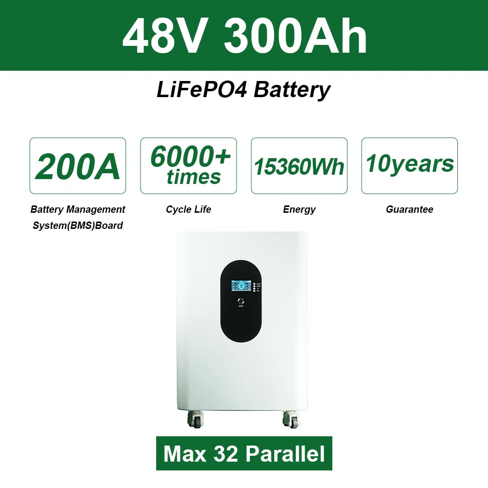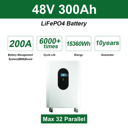 - BMS integrato: 4S100A (100Ah); 4S150A (200Ah/300Ah)
