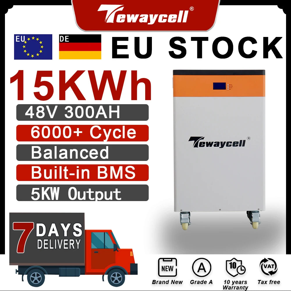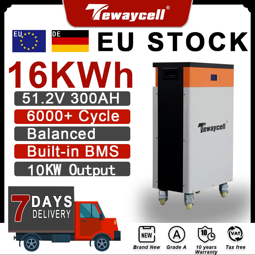 Pacco Batteria Powerwall LiFePO4 15KWh 300Ah con BMS Integrato, 51.2V e 48V, CAN RS485, 6000 Cicli, Esente da Tasse