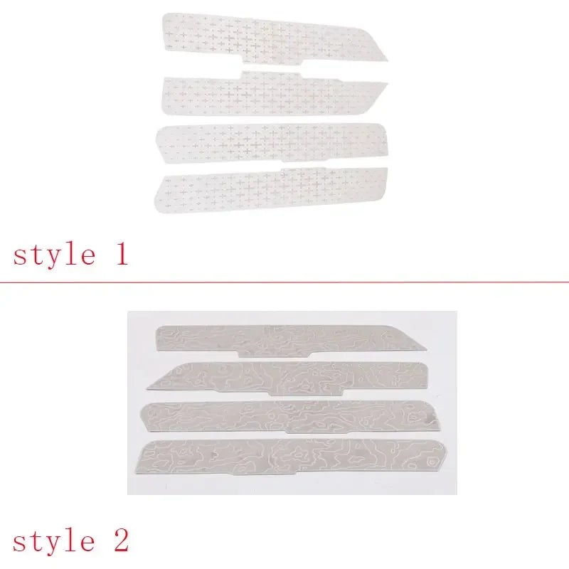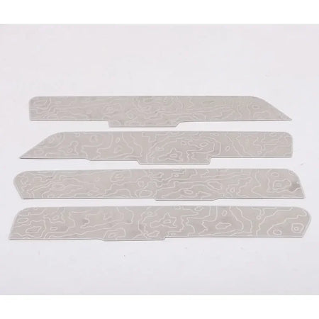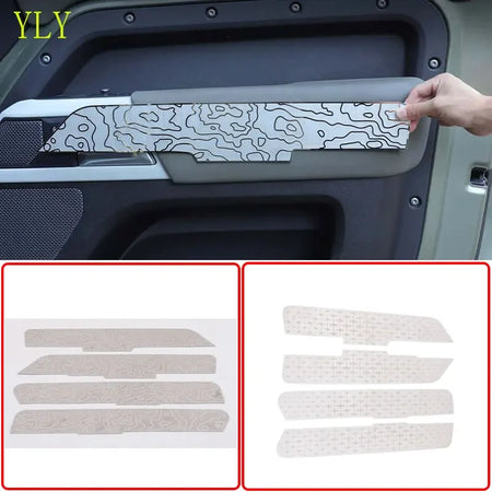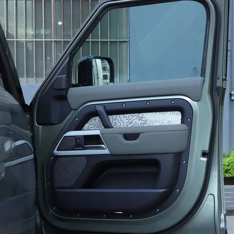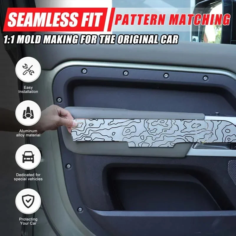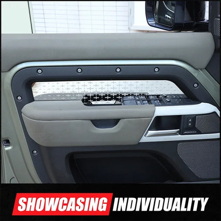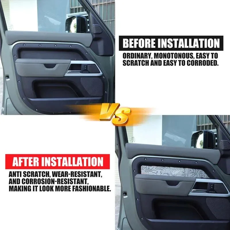 Aggiorna l'interno del tuo Land Rover Defender con l'adesivo per pannello porta interno in acciaio inox Defender 110 130. Realizzato in acciaio inox di alta qualità, questo set di pannelli decorativi offre resistenza a graffi e usura, elevando l'aspetto visivo dell'abitacolo. Progettato specificamente per i modelli Defender 110 e 130 dal 2020 al 2024, aggiunge un tocco metallico elegante e premium che completa gli accenti interni esistenti. Questo set 100% nuovo è prodotto in una struttura certificata ISO9001 e include quattro pezzi per proteggere più pannelli porta interni. L'installazione è versatile e sicura, con opzioni per fissaggio a vite o adesivo biadesivo resistente.