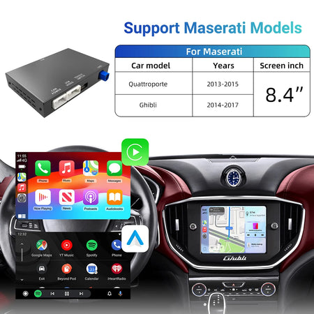 Il Kit di Retrofit CarPlay Maserati Quattroporte di EzoneTronics sblocca l'infotainment moderno per la tua Maserati classica senza cambiare l'aspetto originale. Progettato per i modelli Quattroporte dal 2013 al 2015 e i modelli Ghibli dal 2014 al 2017 dotati del display di fabbrica da 8,4 pollici, questa scatola decodificatrice aggiunge CarPlay e Android Auto ufficiali, preservando lo schermo esistente del cruscotto, il controller rotativo e i comandi al volante per un aggiornamento senza soluzione di continuità e con un feel OEM. Con CarPlay cablato o wireless, puoi pianificare percorsi, riprodurre musica in streaming e fare chiamate in vivavoce direttamente dal tuo cruscotto. Android Auto mantiene le tue app preferite e i comandi vocali a portata di mano, riducendo distrazioni e disordine. Il WiFi integrato 2.4G e 5.8G più Bluetooth 5.0 offrono connessioni affidabili e veloci per una riproduzione multimediale fluida e una navigazione reattiva. Il controllo vocale tramite Hey Siri, insieme ai comandi al volante e ai controlli touch (dove supportati dal tuo veicolo), rende ogni viaggio più sicuro e intuitivo. Google Maps, Apple Maps e Waze forniscono dati sul traffico in tempo reale, così puoi scegliere percorsi più veloci in tempo reale. Il kit supporta anche telecamere AHD PAL/NTSC posteriori e destra tramite 2 ingressi RCA, abilitando telecamere panoramiche HD 360 con linee guida dinamiche e Controllo Distanza Parcheggio, offrendo assistenza al parcheggio in stile OEM. La cosa migliore è che è plug-and-play e non distruttivo, quindi puoi attivare o disattivare CarPlay utilizzando i controlli di fabbrica ogni volta che vuoi. Vantaggi & Suggerimenti