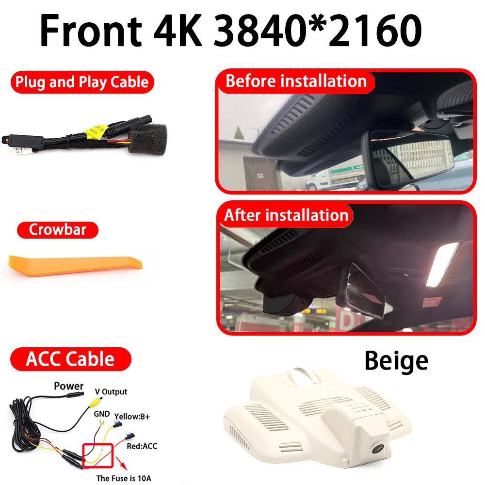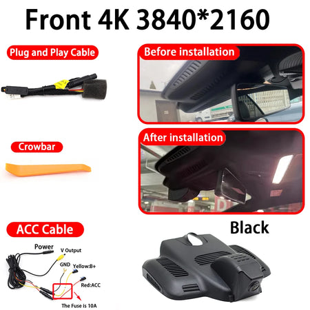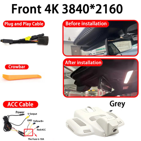 Specificamente adattato per i modelli Mercedes, inclusi E Classe W213/S213/C238 (2016–2023) e C Classe W205/S205/C205 (2015–2022), enfatizza un approccio plug-and-play. In molte configurazioni, l'alimentazione può essere prelevata tramite il sensore della pioggia o la luce di lettura, consentendo un'installazione rapida e non invasiva che preserva lo stile originale della tua auto mentre aggiunge funzionalità avanzate di sorveglianza. La telecamera anteriore 4K e la telecamera posteriore 1080P offrono un campo visivo di 170°, mentre funzionalità come Visione Notturna, Ampio Intervallo Dinamico, G-Sensor, Monitor di Parcheggio e Sorveglianza in Tempo Reale ti aiutano a guidare con fiducia e documentare eventi con riprese credibili.