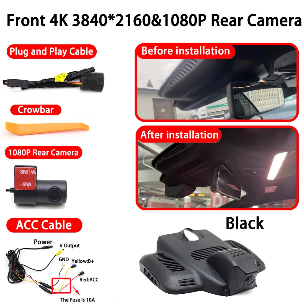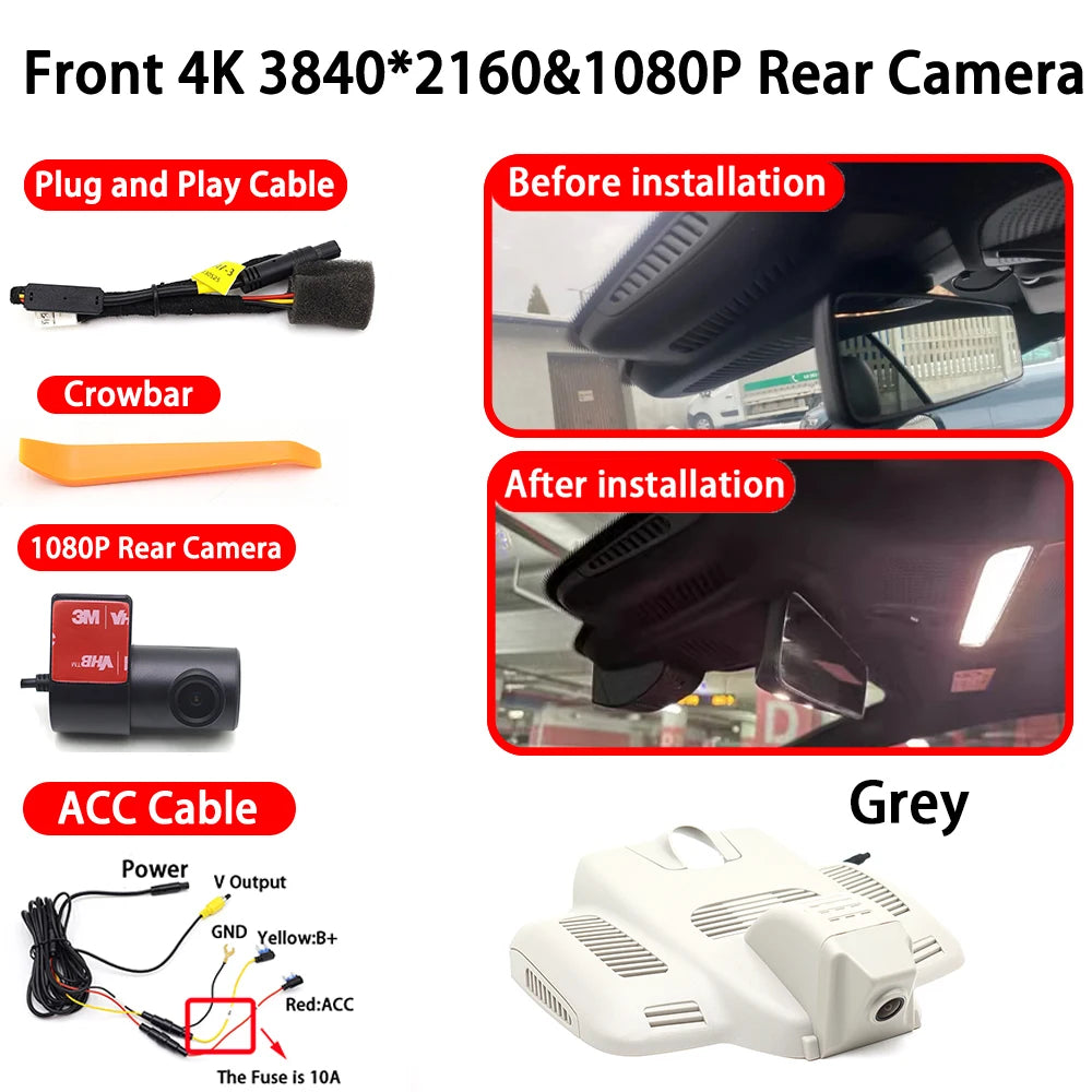 Dash Cam, 4K Anteriore e Posteriore con WiFi, progettata per Mercedes-Benz Classe C W213 W205, offre riprese frontali ultra-chiare a 4K (3840x2160) e video posteriori affidabili per una copertura completa. Con connettività WiFi, puoi visualizzare, salvare e condividere clip dal tuo telefono, mentre il registratore GPS interno tiene un registro accurato dei tuoi viaggi. Questo DVR per auto a doppio canale è progettato per integrarsi con l'interno della tua Mercedes e fornire prove affidabili per la guida quotidiana, i viaggi su strada e gli incidenti di parcheggio.