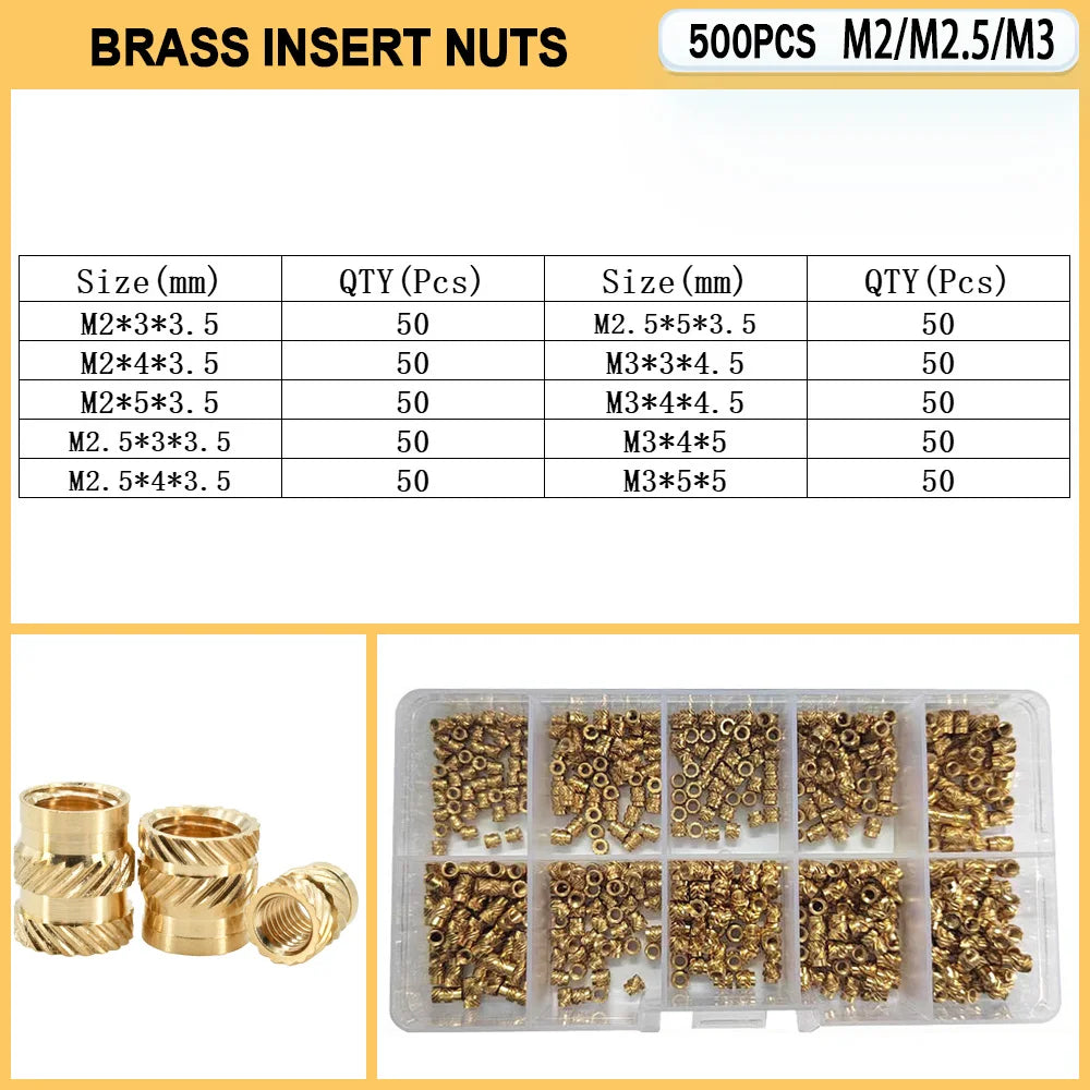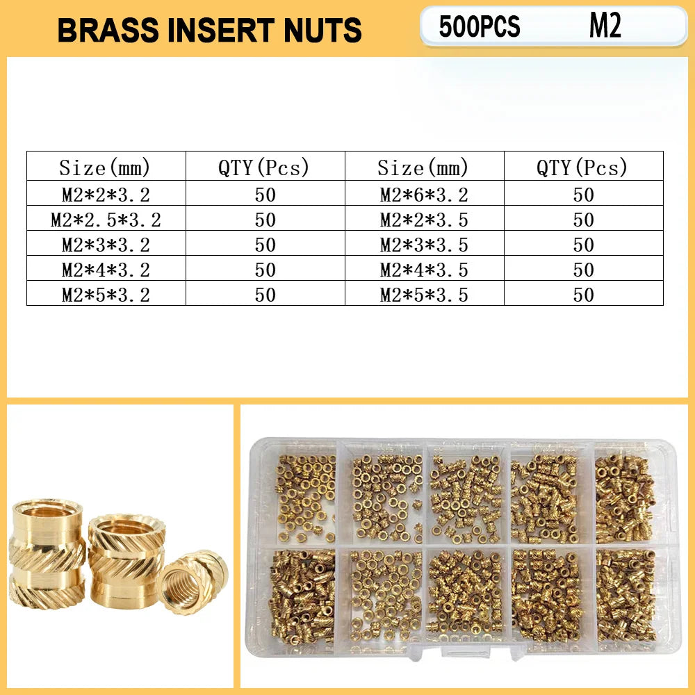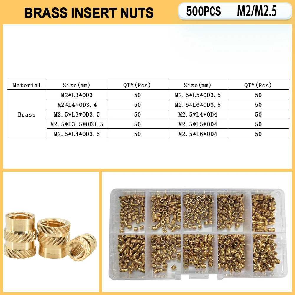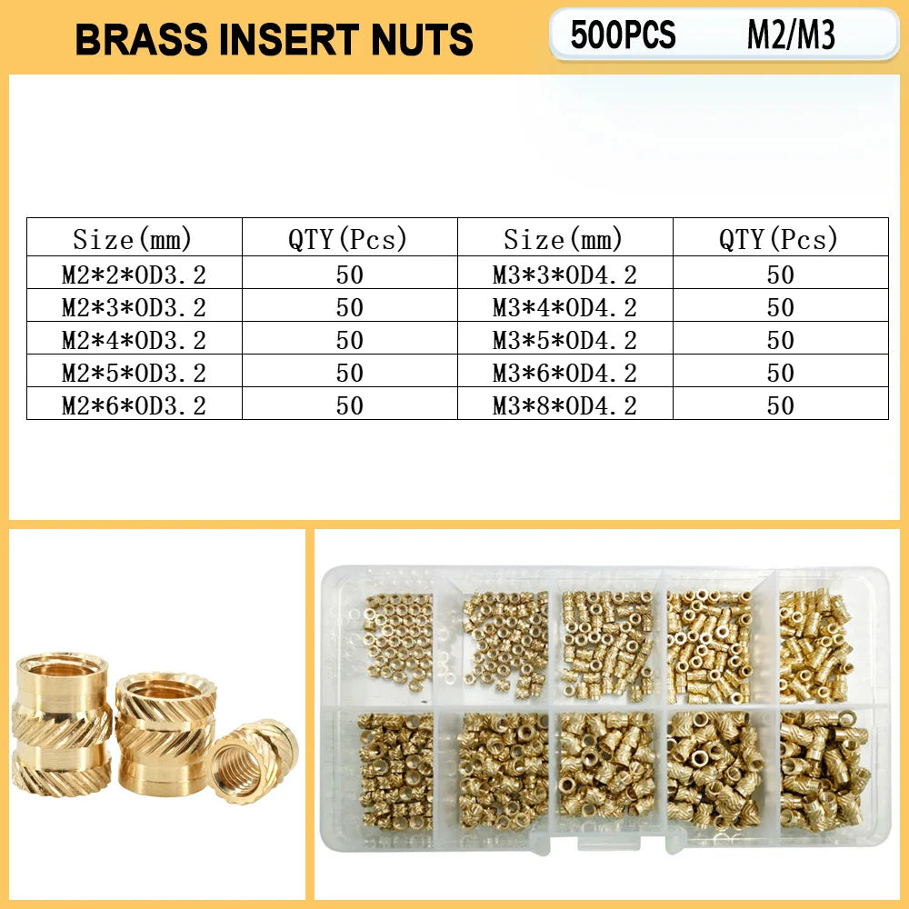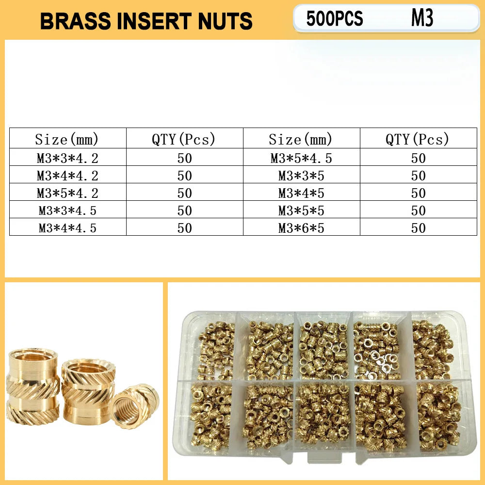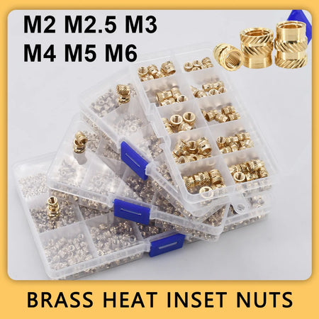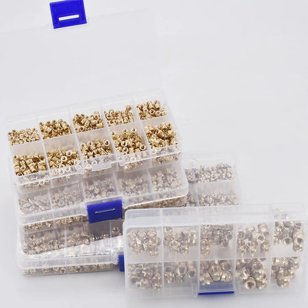 Incontra il kit di dadi a inserto in ottone M2 a M6 zigrinati per la stampa 3D — una collezione essenziale per aggiungere filetti metallici durevoli alle tue parti in plastica. Questo kit di sei dimensioni copre gli inserti M2, M2.5, M3, M4, M5 e M6, ciascuno con un esterno zigrinato che afferra il materiale ospite per una vestibilità sicura e duratura. Perfetto per involucri stampati in 3D, pannelli di montaggio e progetti hobby che richiedono un'assemblaggio e disassemblaggio affidabili. Dimensione del dado a inserto in ottone = diametro interno * altezza * diametro esterno.