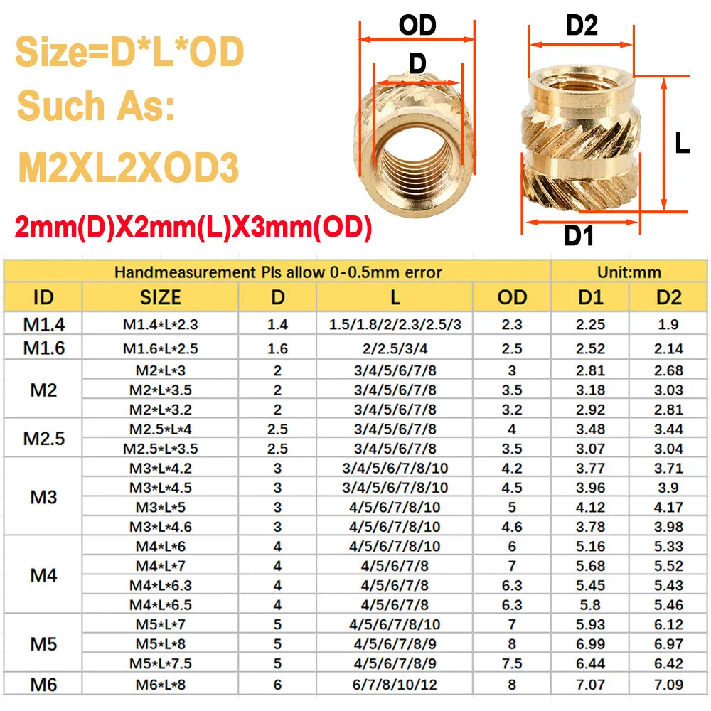 - Dimensione: Dimensione del dado a inserto in ottone = diametro interno * altezza * diametro esterno