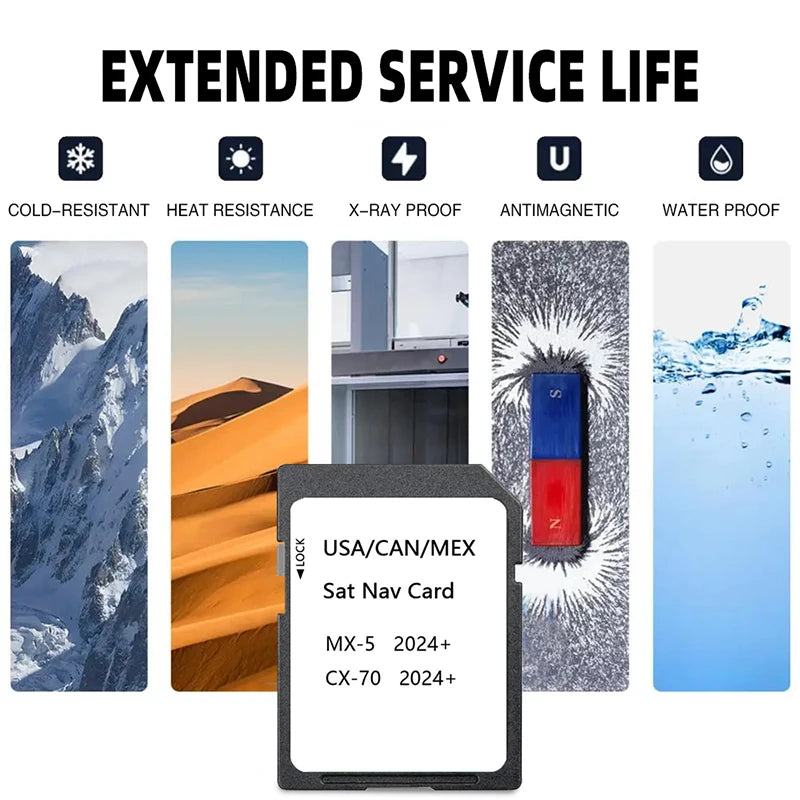 Scheda SD GPS Nord America per Mazda CX70 MX5 - Mappe Aggiornate — Scheda SD affidabile da 16GB precaricata con le ultime mappe di navigazione del Nord America per i sistemi multimediali delle auto Mazda CX70 e MX5. Progettata per un accesso rapido alle mappe, lettura/scrittura ad alta velocità e integrazione senza soluzione di continuità con la navigazione GPS in auto.