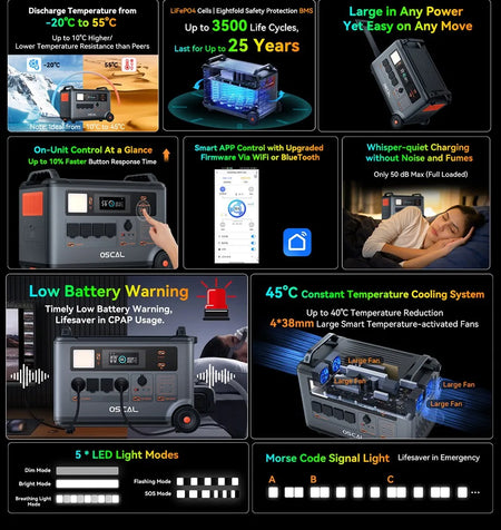 La stazione di alimentazione robusta Oscal PowerMax6000 da 6000W è una fonte di energia durevole e ad alta capacità progettata per ambienti difficili e vita off-grid. Costruita con tecnologia batteria LiFePO4 (Litio Ferro Fosfato), offre 3.600Wh di capacità utilizzabile con un'impressionante potenza continua di 6.000W e una capacità di picco di 9.000W per gestire utensili e apparecchiature ad alto consumo. Che tu sia fuori rete, in un cantiere, in campeggio o preparandoti per emergenze, questa stazione di alimentazione robusta mantiene i tuoi dispositivi essenziali funzionanti senza sfarfallii o interruzioni.