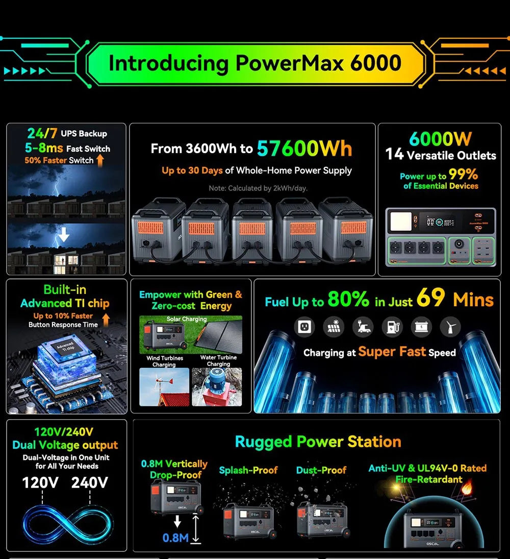 Oscal PowerMax6000 Stazione di Alimentazione Robusta 6000W Doppia 120V e 240V Batteria LiFePO4 3600Wh-57600Wh 3500 Cicli di Vita Solare