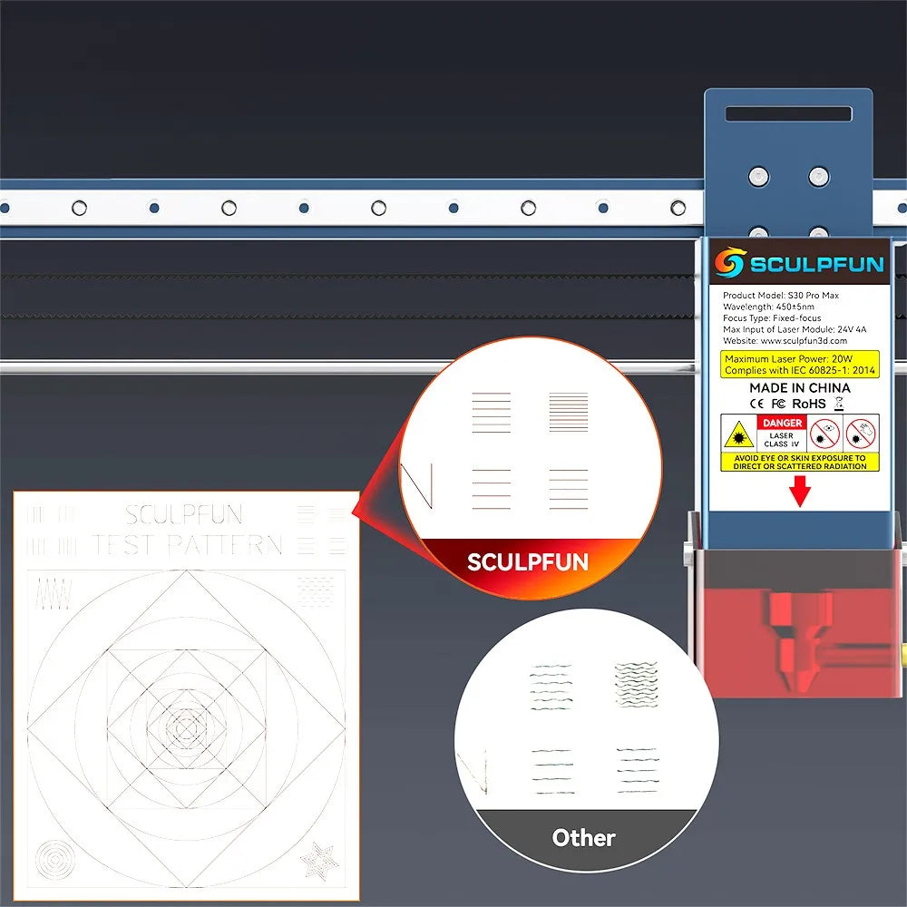 Incontra lo SCULPFUN S30 Pro Max 20W Laser Engraver Cutter, un sistema laser potente e preciso progettato per professionisti, negozi e maker ambiziosi. Con un laser ultra-sottile da 20W e un fuoco laser fine come 0,08x0,1mm, offre incisioni nitide e tagli puliti su una varietà di materiali. Costruito su un robusto telaio in lega di alluminio, lo S30 Pro Max è progettato per resistere a carichi di lavoro impegnativi mantenendo un'alta precisione.