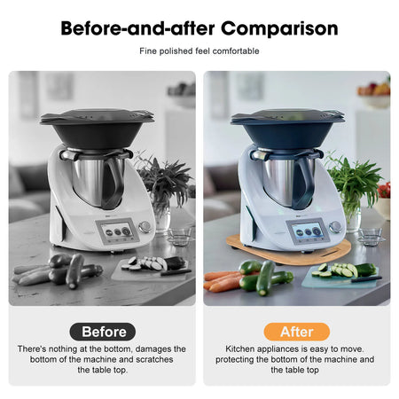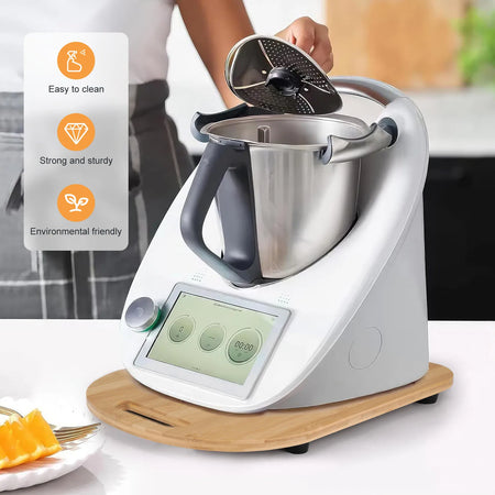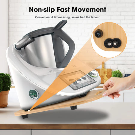 Progettato per Thermomix TM6 e TM5, offre una capacità di carico affidabile e una mobilità fluida. Sul retro presenta due binari di scorrimento in teflon, così puoi sollevare e far scorrere il tuo apparecchio con facilità. La funzione antiscivolo si attiva quando sollevi la parte anteriore, mantenendo la macchina sicura anche quando lasciata incustodita. Quattro piedini in gomma aiutano ad assorbire le vibrazioni e a minimizzare il rumore durante l'impasto e la miscelazione, mantenendo la tua cucina tranquilla.