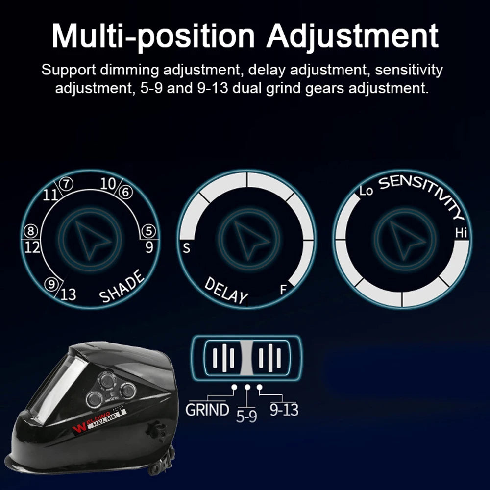 - Personalizza la protezione per la saldatura MIG, TIG o a elettrodo regolando l'oscuramento (5-9 o 9-13), la sensibilità e il ritardo per una visibilità chiara e risultati più sicuri.