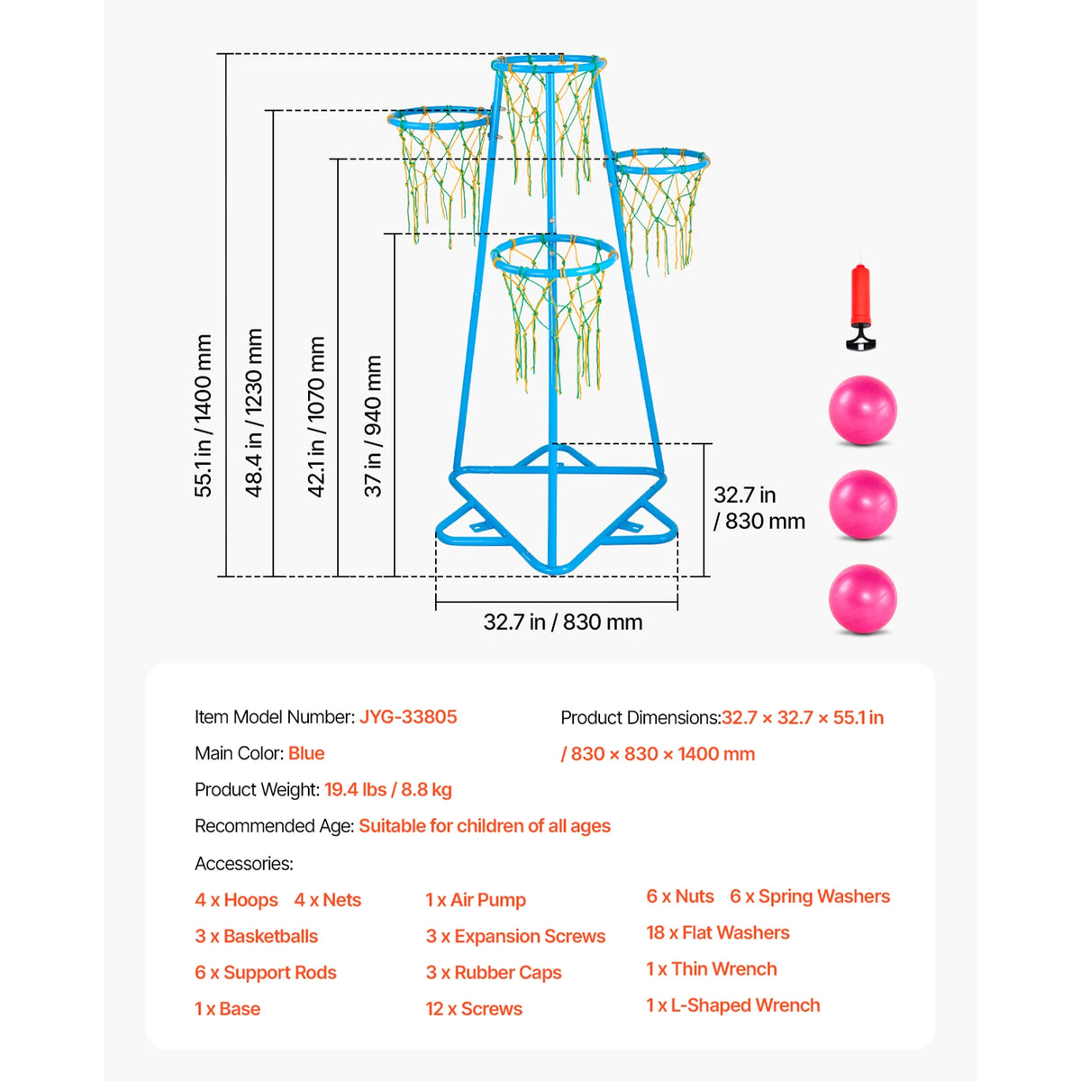 JYG-33805 – Altezze Regolabili Con 3 Palloni Inclusi — Un set di basket compatto e regolabile con 4 cerchi progettato per sviluppare le abilità di afferrare e muoversi per i bambini piccoli. Costruzione in metallo durevole e tre palloni morbidi lo rendono ideale per il gioco indoor e l'apprendimento precoce degli sport.