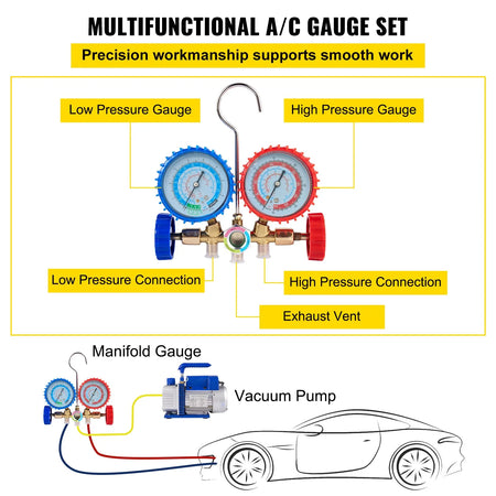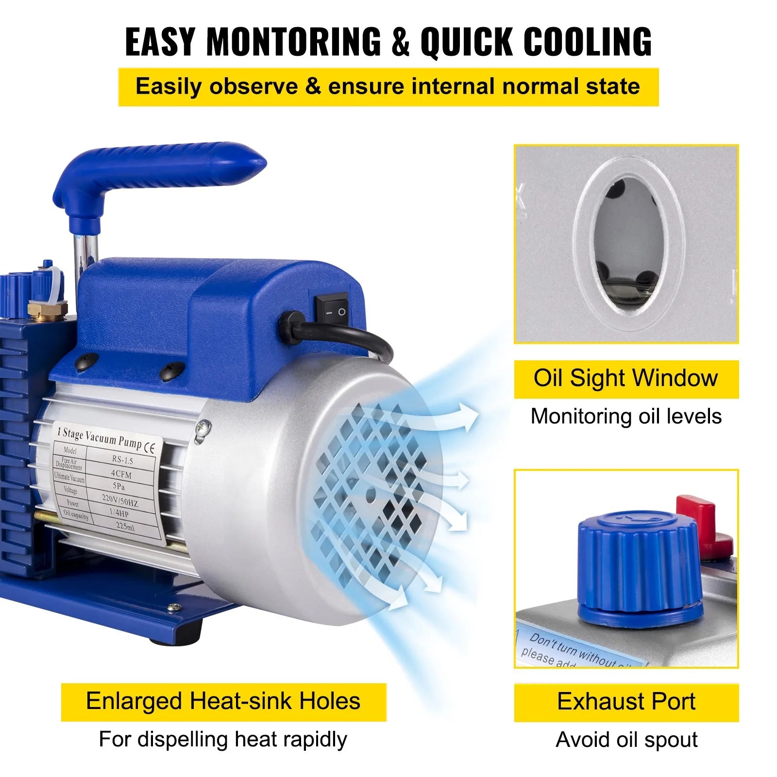 Progettata per un servizio facile e preciso, questa pompa per vuoto dispone di due manometri da 2-1/2" (blu per il basso e rosso per l'alto) per un rapido monitoraggio del vuoto e della pressione. Un vetro di controllo dell'olio integrato ti permette di monitorare i livelli dell'olio a colpo d'occhio, aiutando a prevenire carenze di olio. La pompa è abbinata a un kit completo di strumenti per refrigeranti, incluso un set di manometri multifunzionali con vetro di controllo e tubi codificati a tre colori per una chiara gestione del flusso del refrigerante. Nota che l'olio non è incluso.