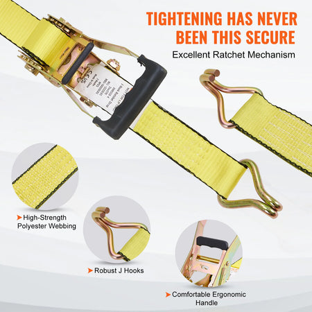 Cinghie a cricchetto SucceBuy 4PK J Hook – 10000 LB — Cinghie a cricchetto pesanti progettate per fissare il carico con fiducia. Progettate per trasportare, spostare e legare carichi su camion, rimorchi o portapacchi, queste cinghie in poliestere da 2" offrono un'alta resistenza alla trazione e un affidabile fissaggio con gancio a J.