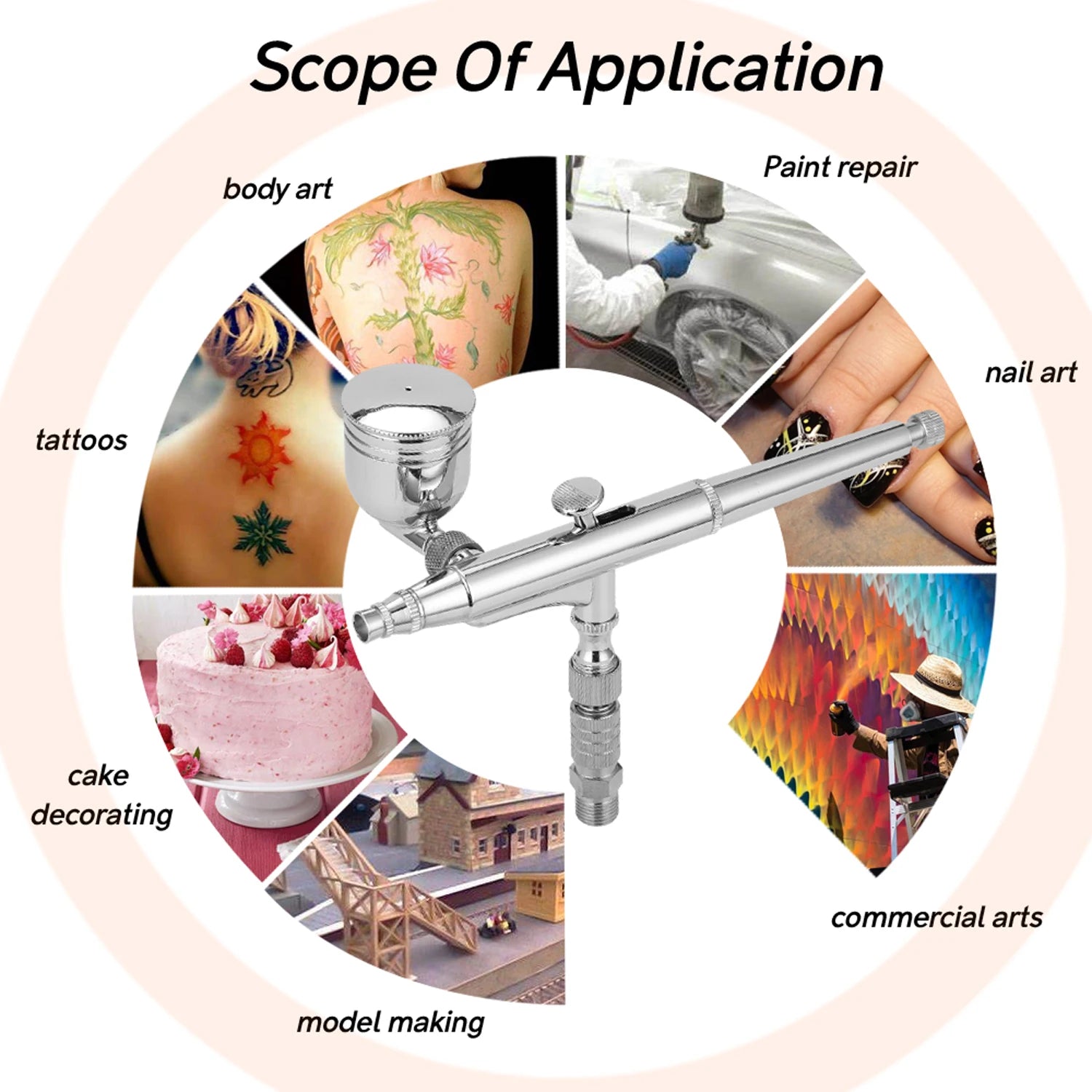 Questo kit è perfetto per una vasta gamma di compiti creativi: illustrazione, belle arti commerciali, ritocco fotografico, grafiche automobilistiche personalizzate, grafiche per motociclette, nail art, cosmetici, miniature, artigianato e decorazione di torte. Costruito con componenti in rame per la durata, funziona silenziosamente ed efficientemente a 15–50 PSI, offrendo prestazioni affidabili per un uso quotidiano.