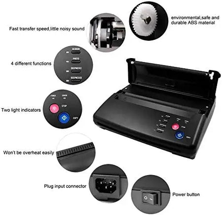 La stampante per tatuaggi funziona con stampa a trasferimento veloce, basso calore e basso rumore, aiutandoti a mantenere il flusso di lavoro fluido e confortevole sia per l'artista che per il cliente. È facile da imparare e usare, senza regolazioni inutili. Le caratteristiche includono copia speculare e copia normale con avviso di surriscaldamento, oltre a opzioni per specchio, foto e due profondità di copia (I e II) per adattare lo stencil al tuo modello.
